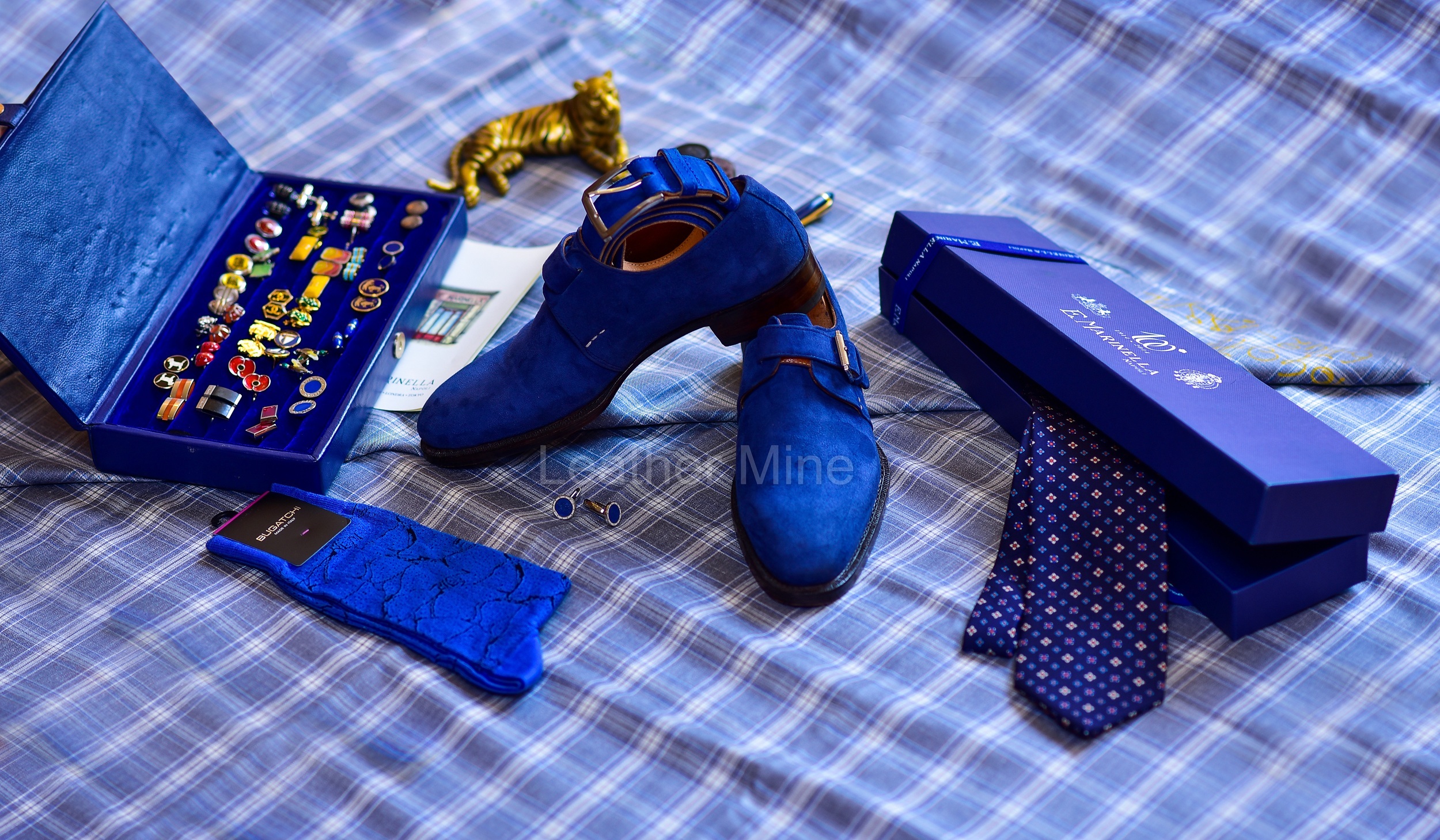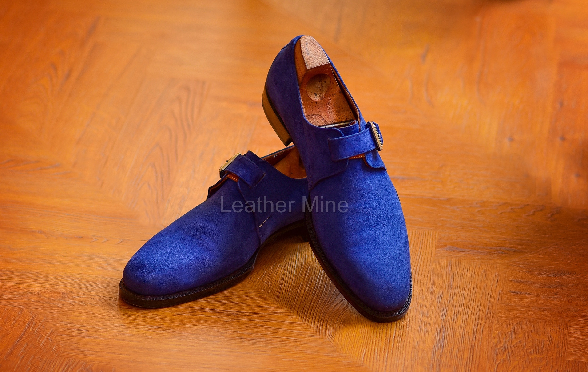 Leather Dress Shoes Men's Handmade Blue Suede Monk Strap Shoes