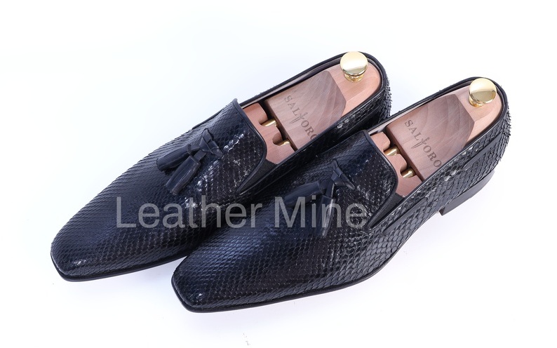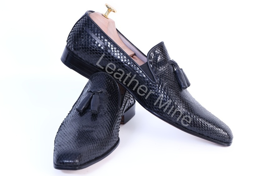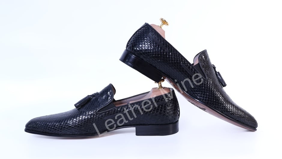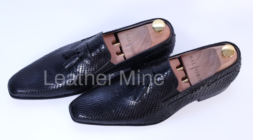 Real Snake skin Black Tassel Loafers Dress shoes Men's, Handmade Leather Shoes