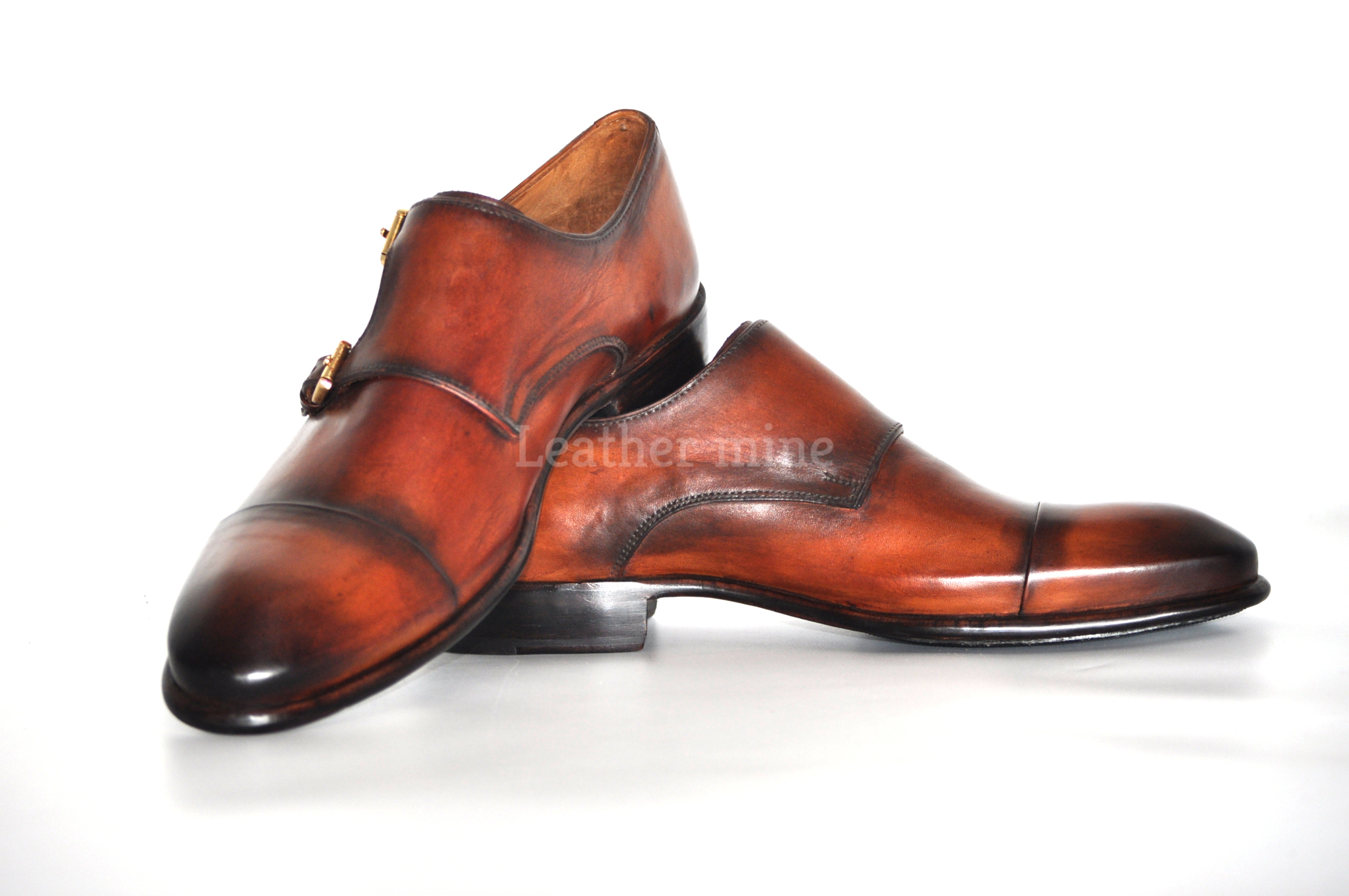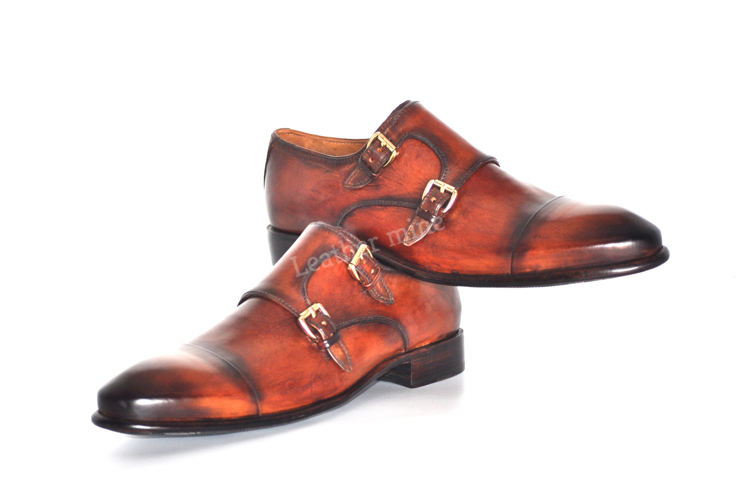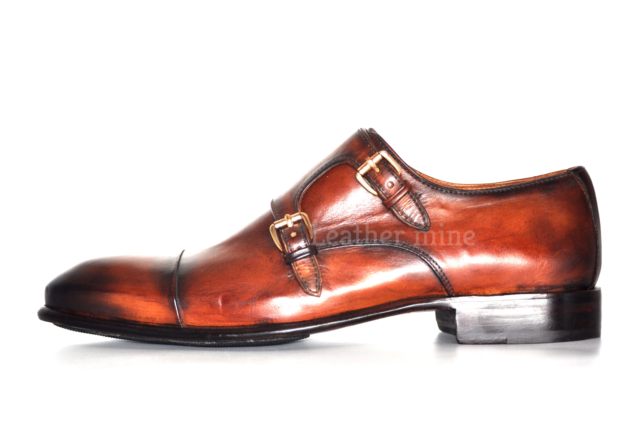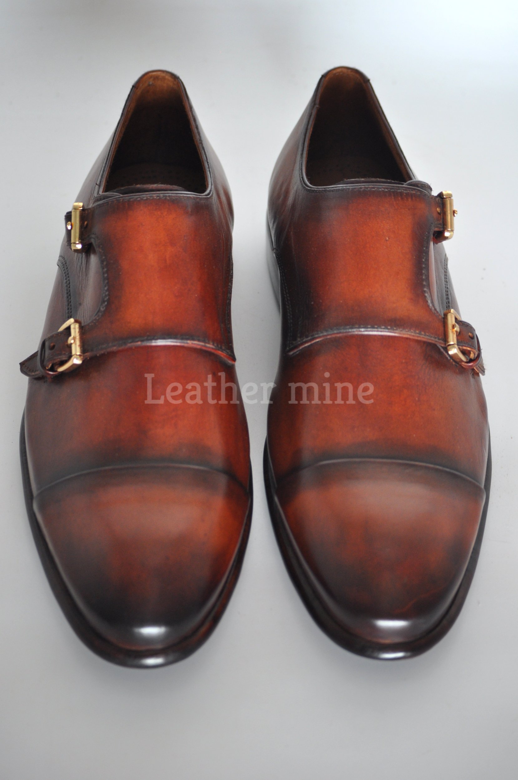 Handmade Brown Patina Santoni Double Monk Strap Leather Shoes Men', Formal Shoes