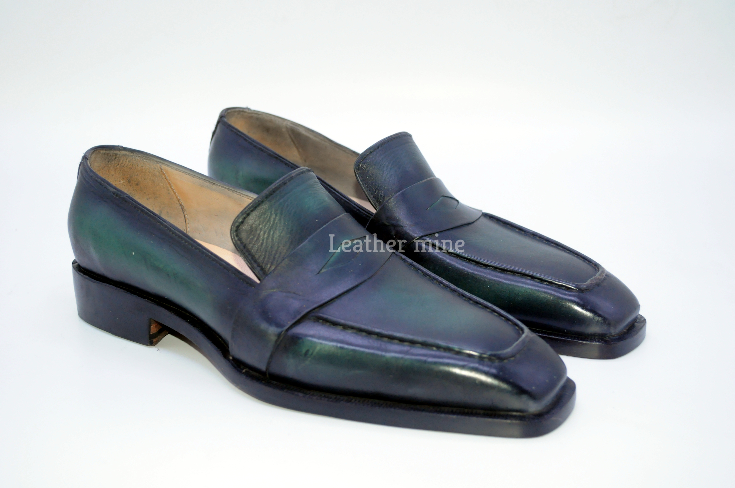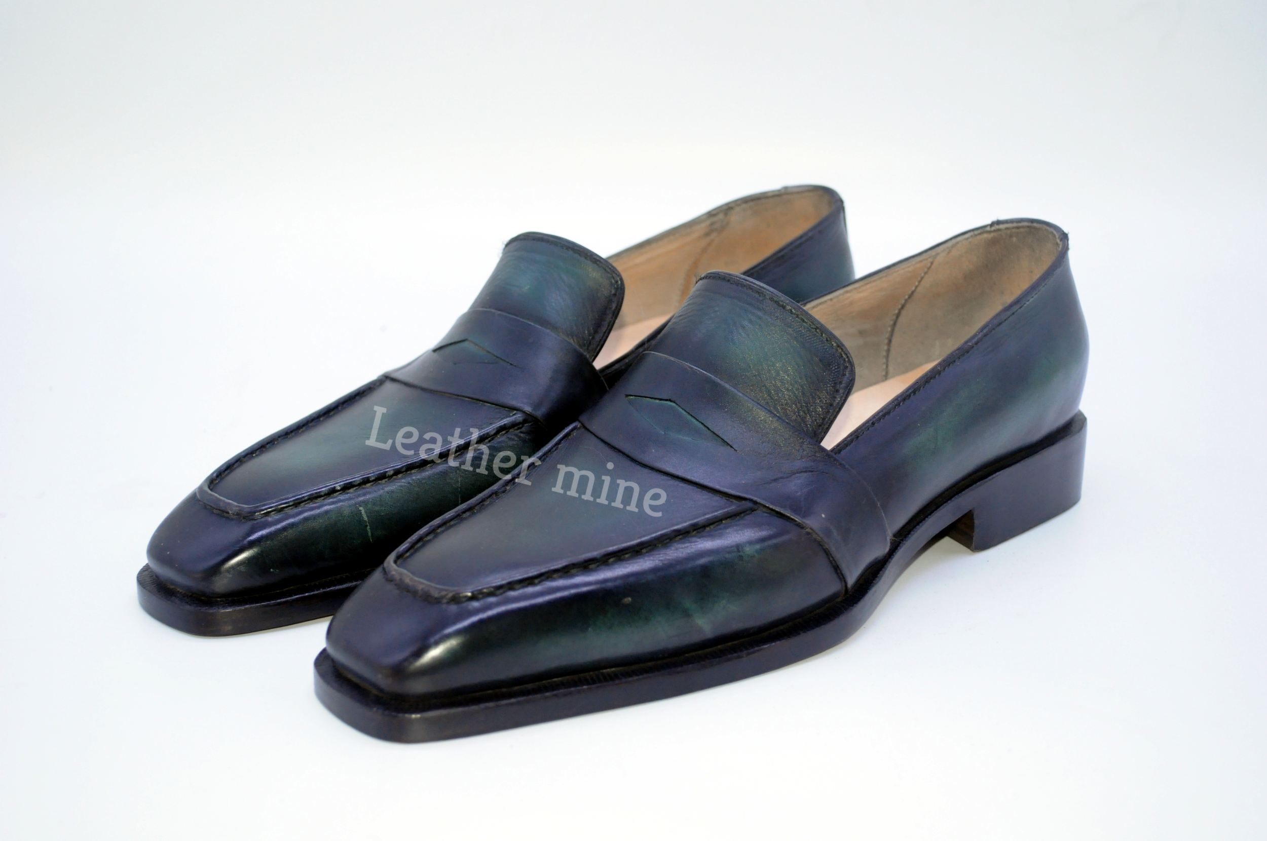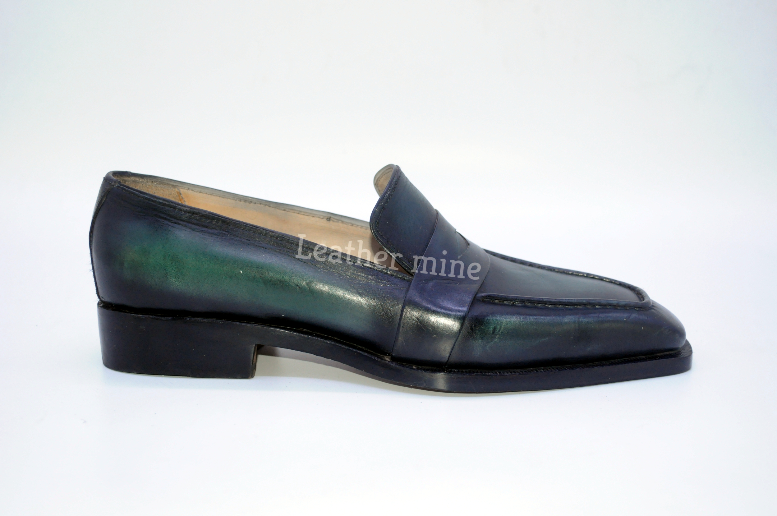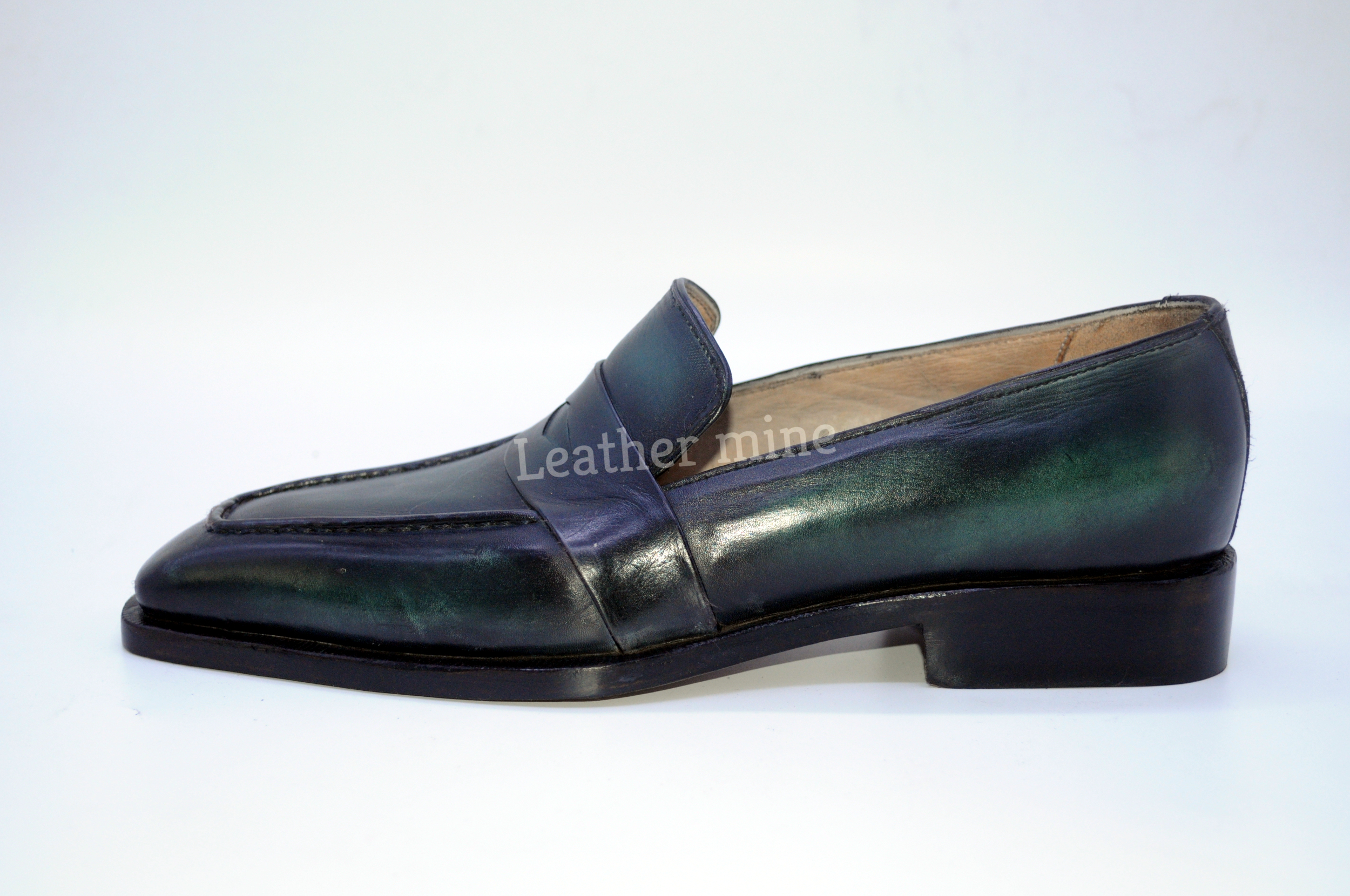 Handmade Green Patina Leather Loafer's, Dress shoes Men's, Handmade Leather Shoes, Formal Shoes
