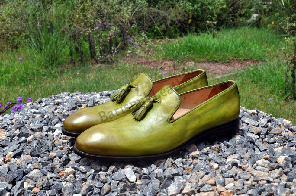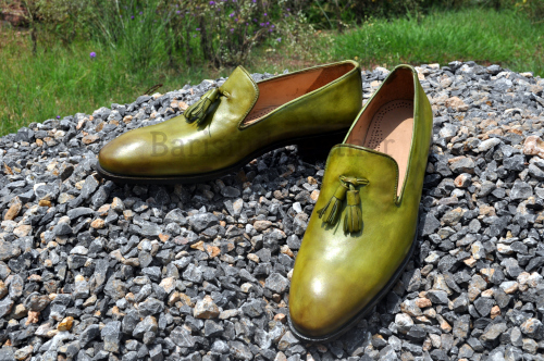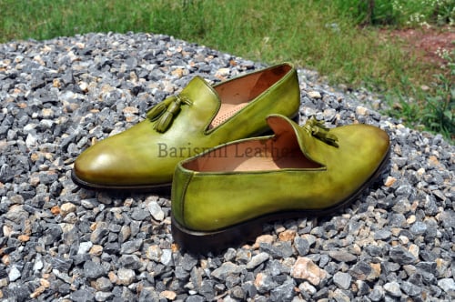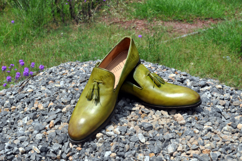 Handmade Leather Olive Green Patina Tassel Loafer's, Dress shoes Men's, Handmade Leather Shoes, Formal Shoes