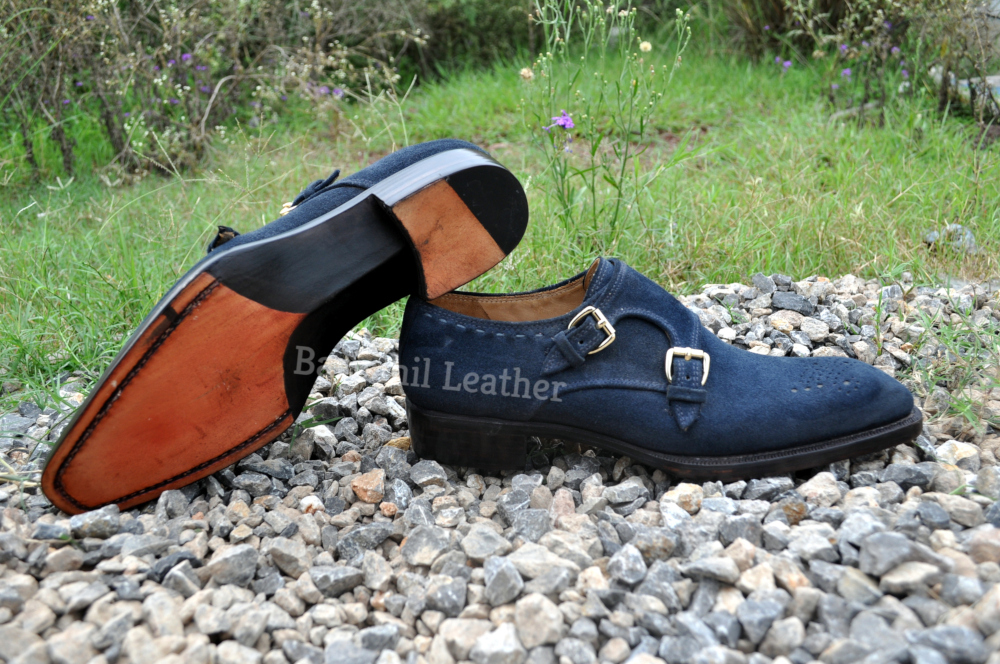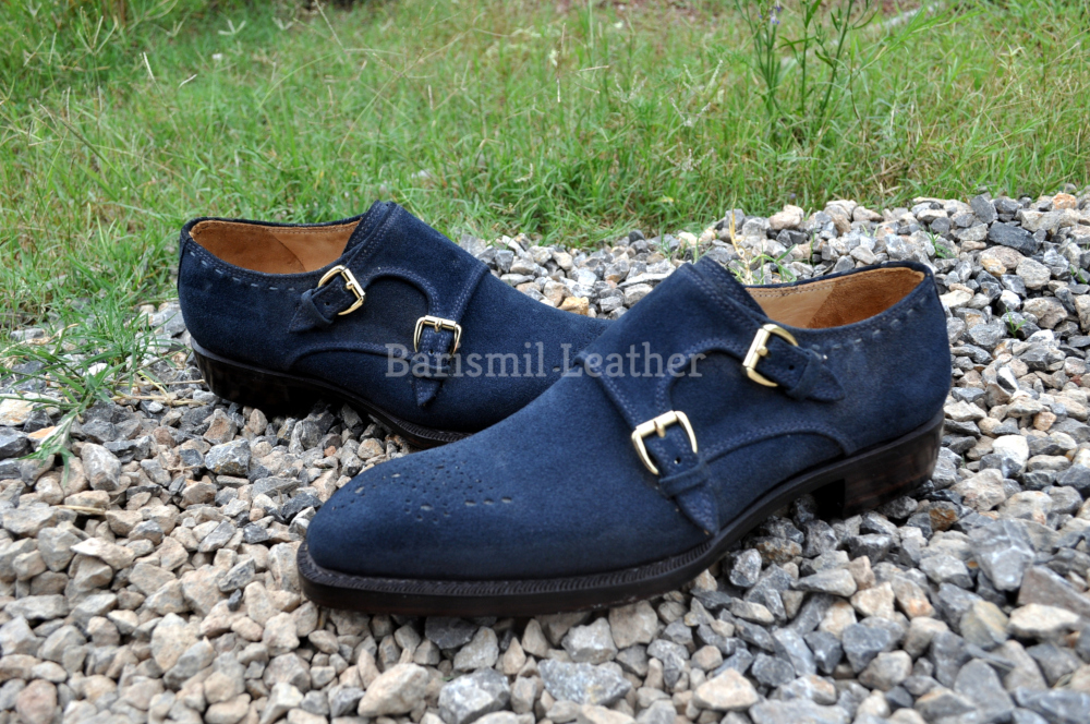 Double Monk Handmade Navy Blue Suede Leather Men Dress Shoes