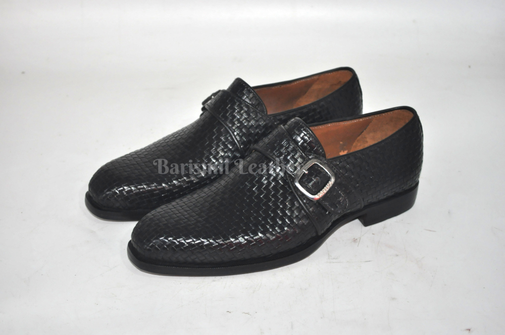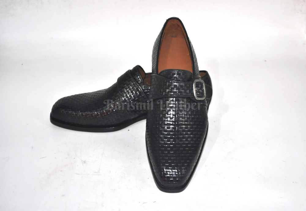 Handmade Black Woven Leather Monk Strap Leather Men Dress Shoes