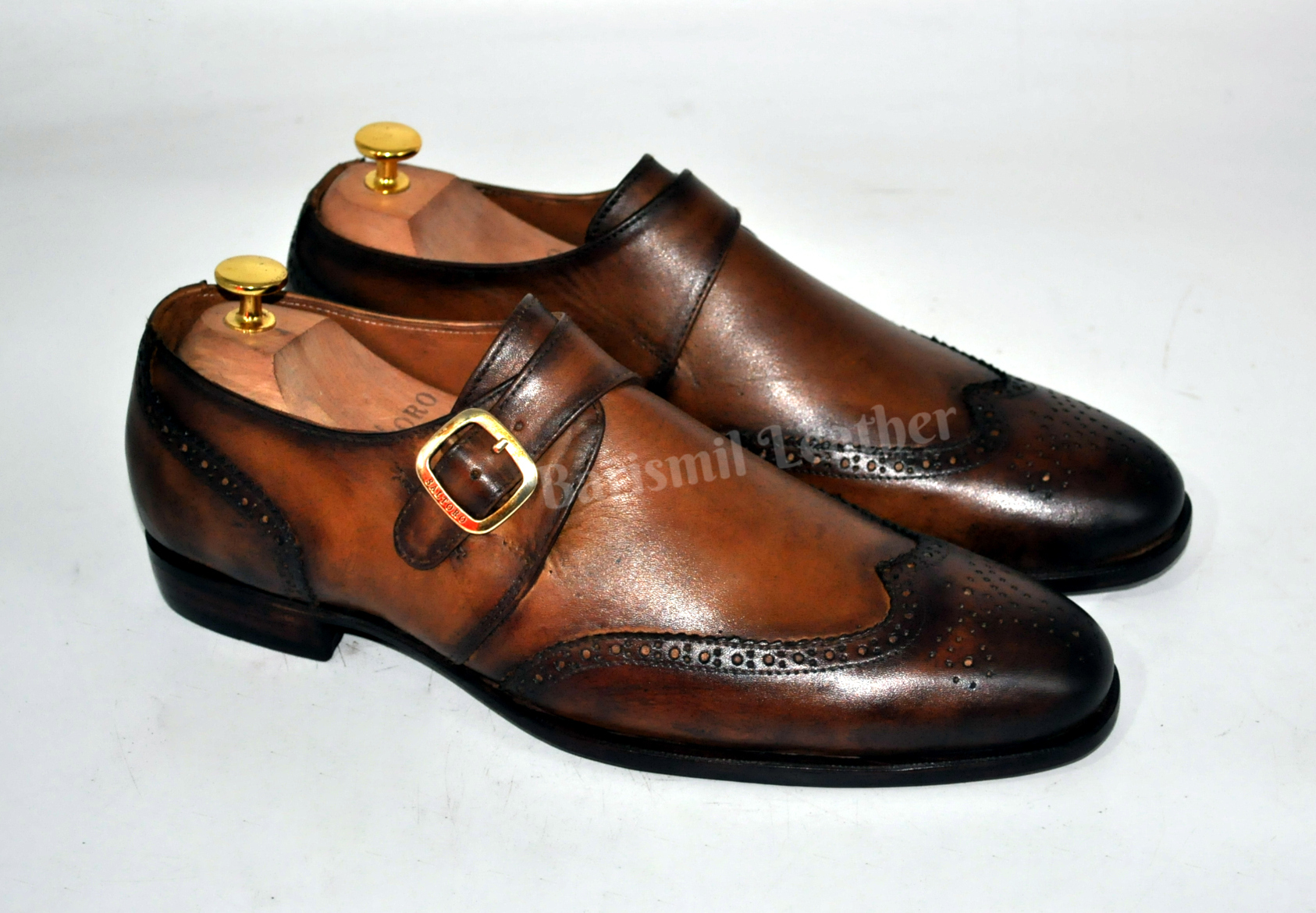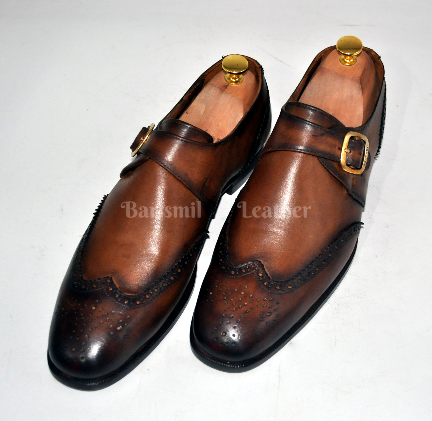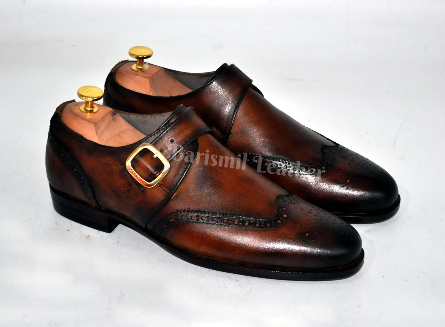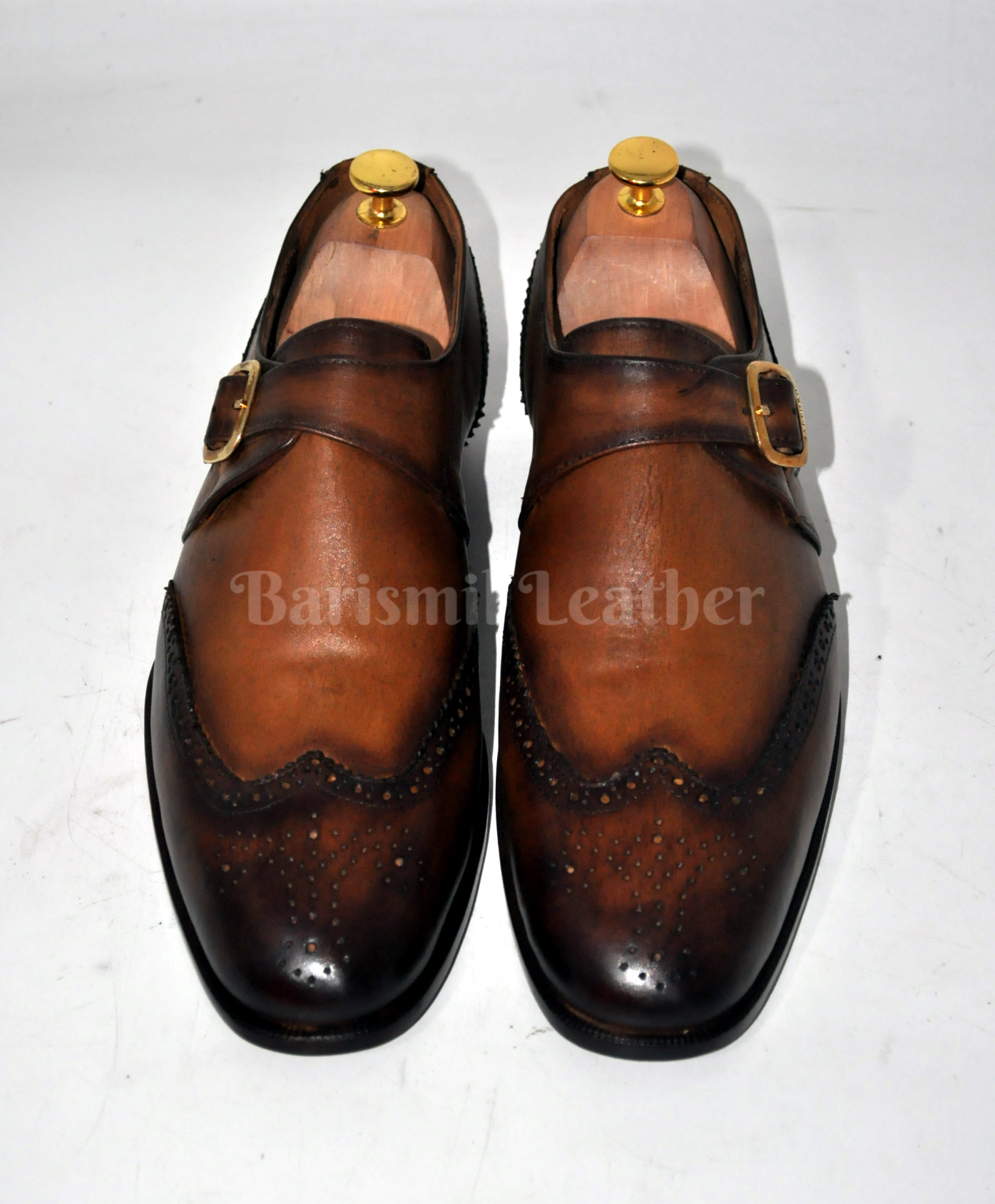 Handmade Leather Brown Patina Wingtip Monk Strap Dress Shoes Formal Shoes for Men