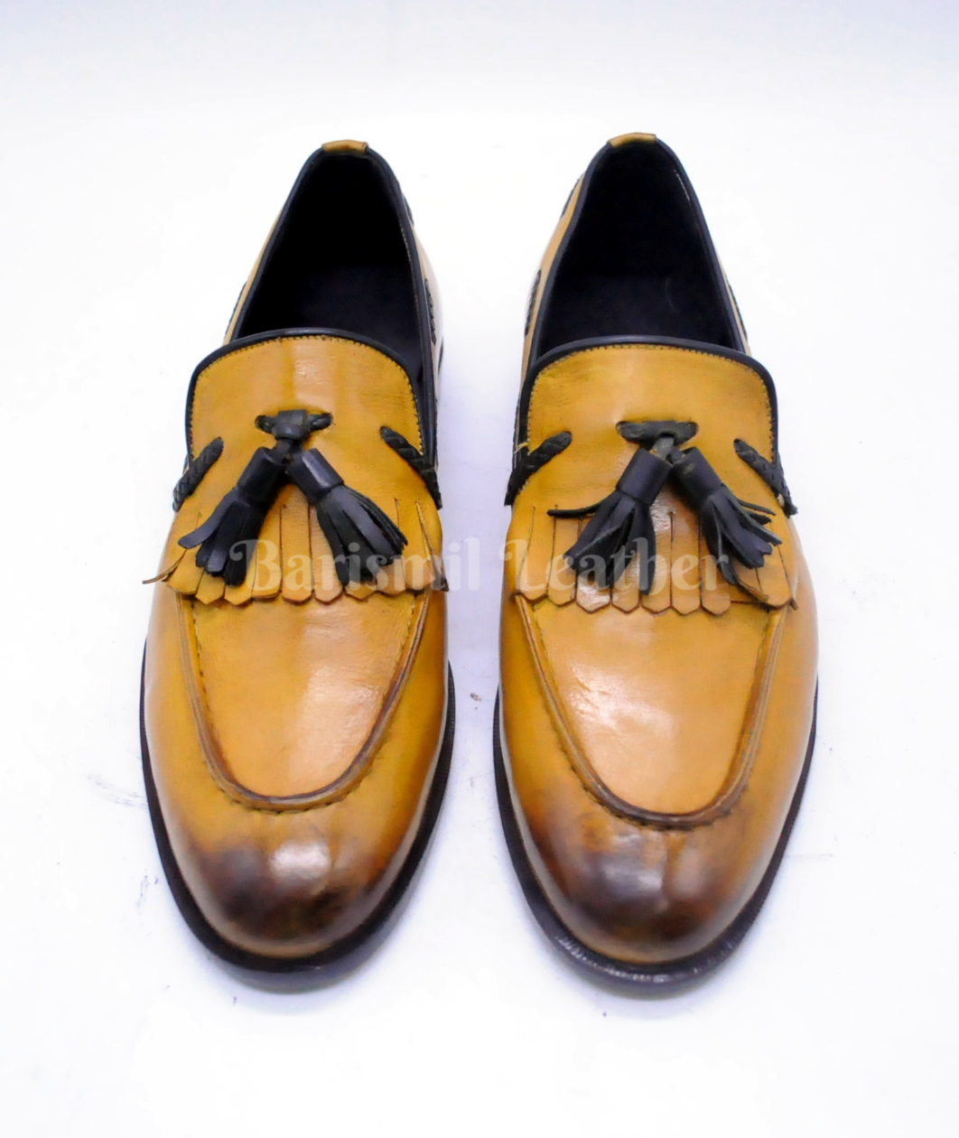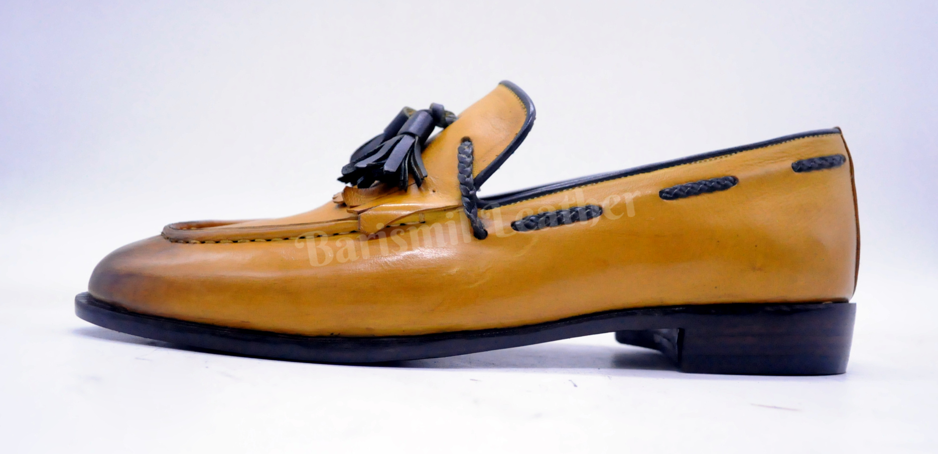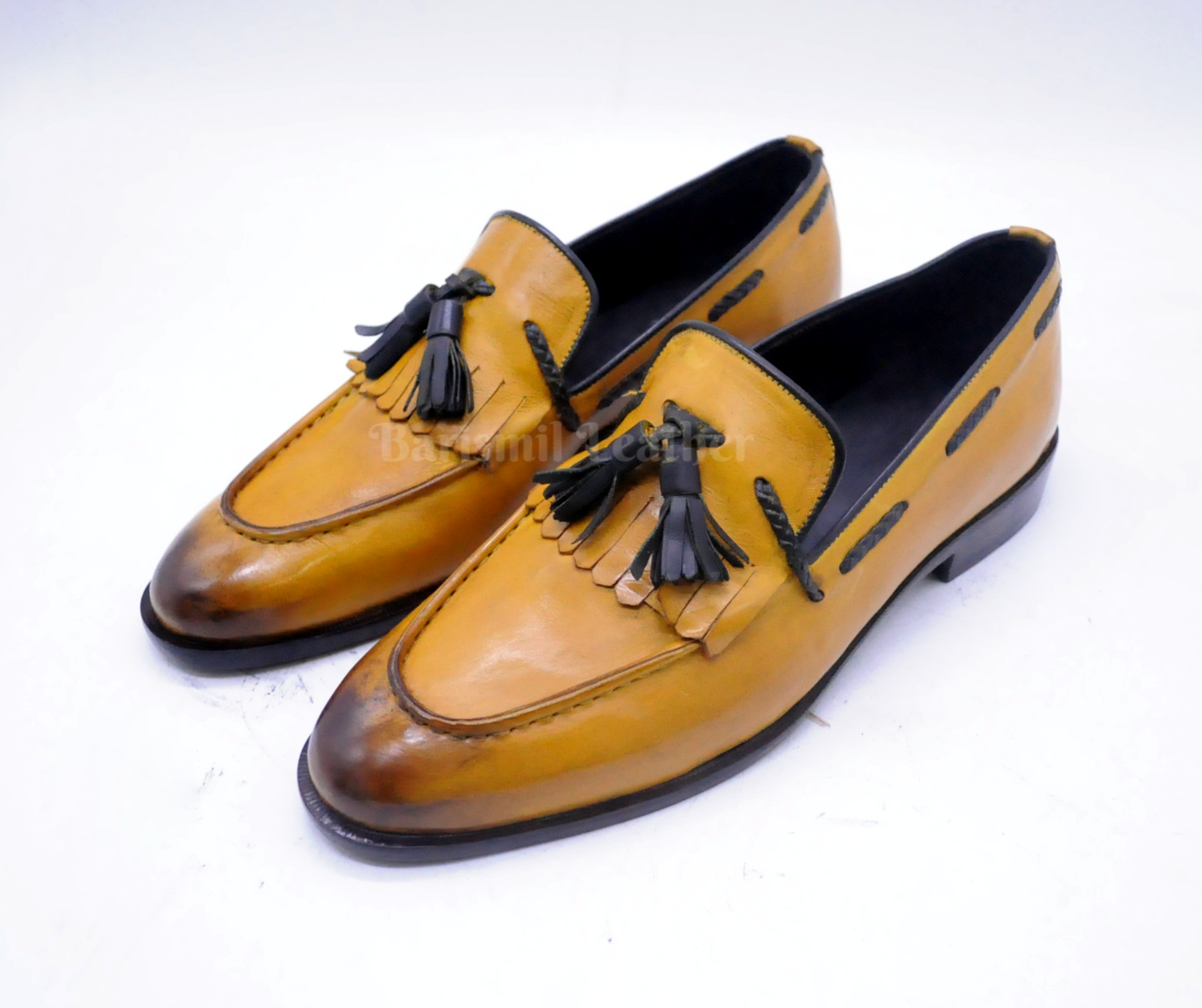 Handmade Leather Yellow patina Tassels Frill Loafers Dress Shoes for Men Formal Dress shoes