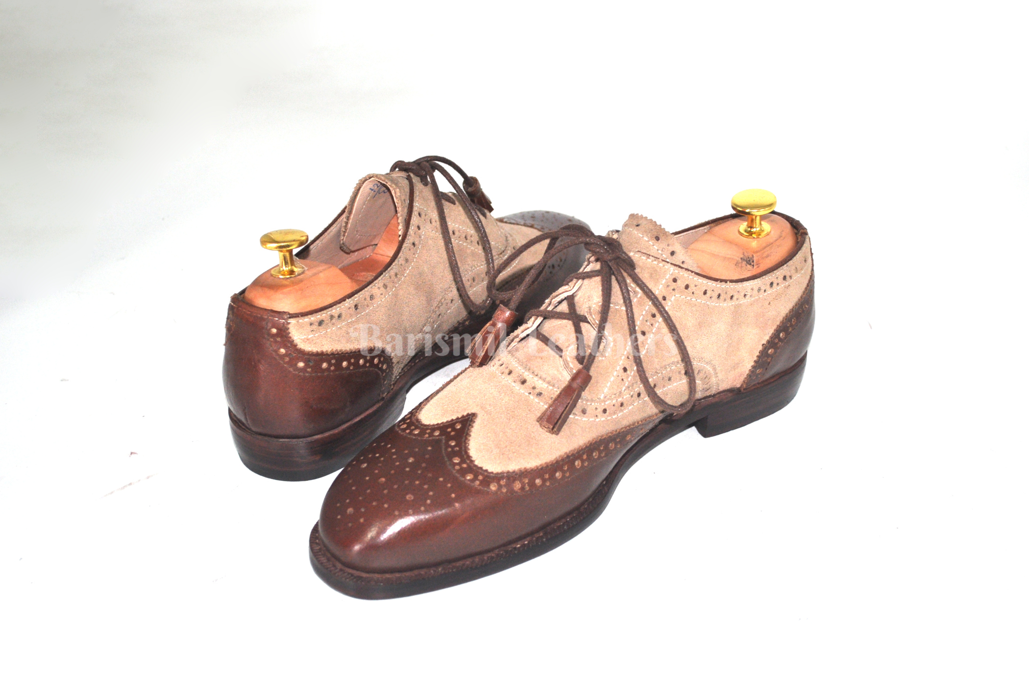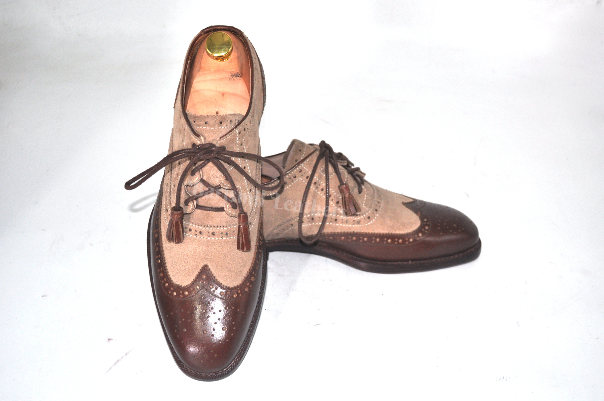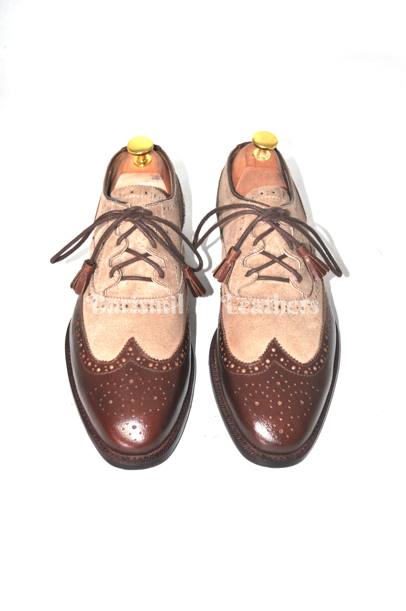 Men's handmade lace up oxfords leather wingtip and brogue two tone men dress formal leather tassels lace up shoes.