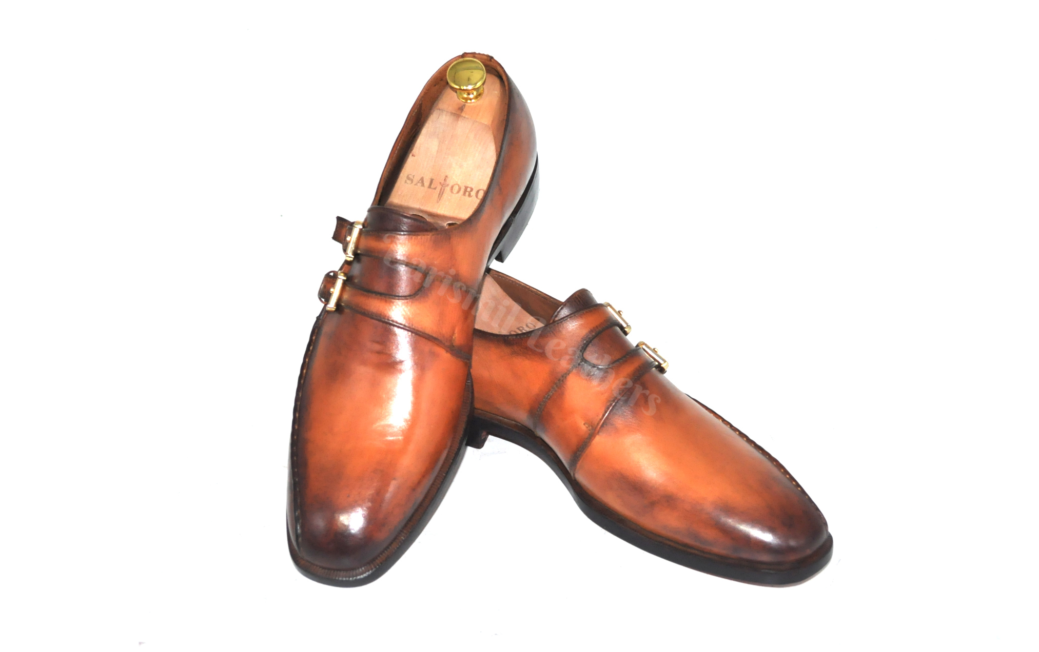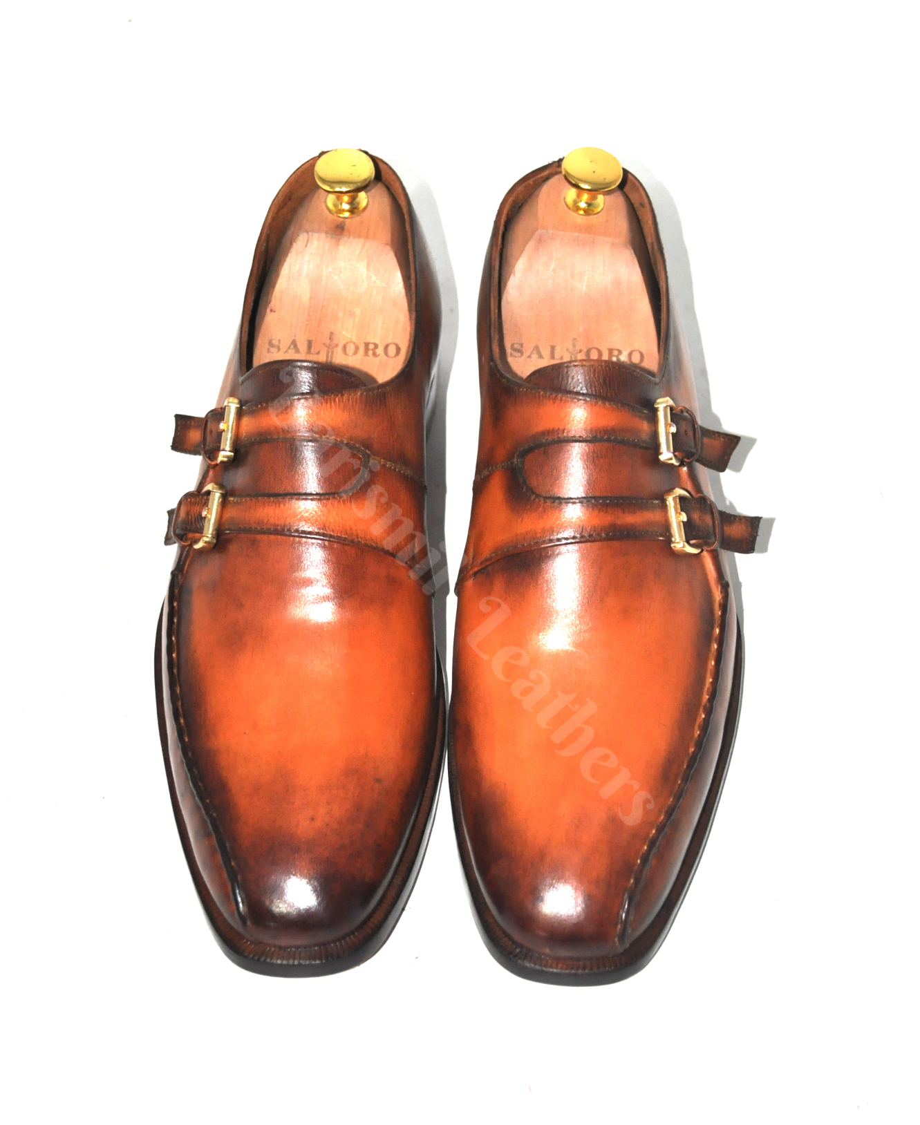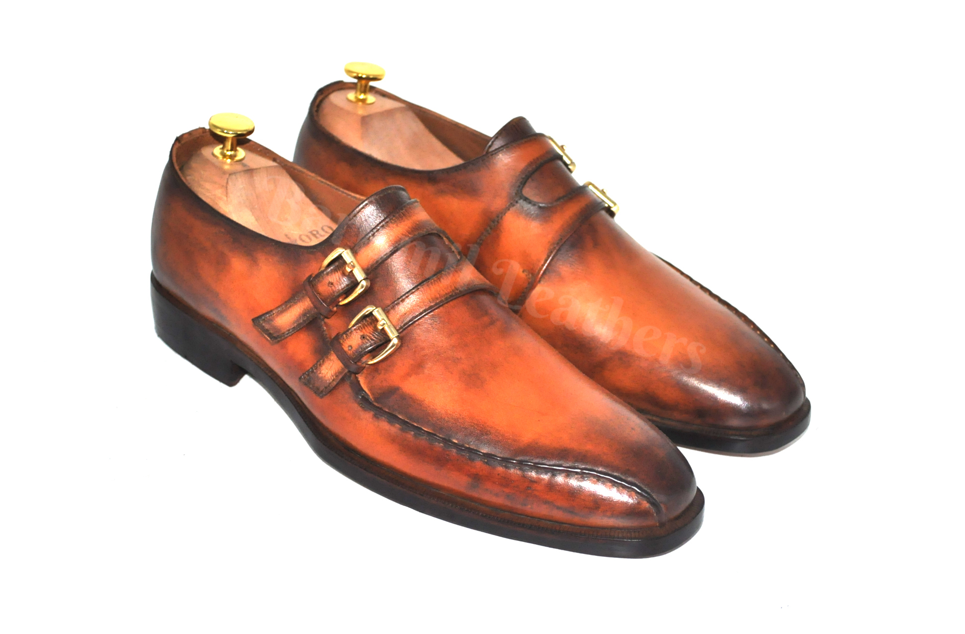 Handmade leather double monk brown patina dress monk strap shoes for men.