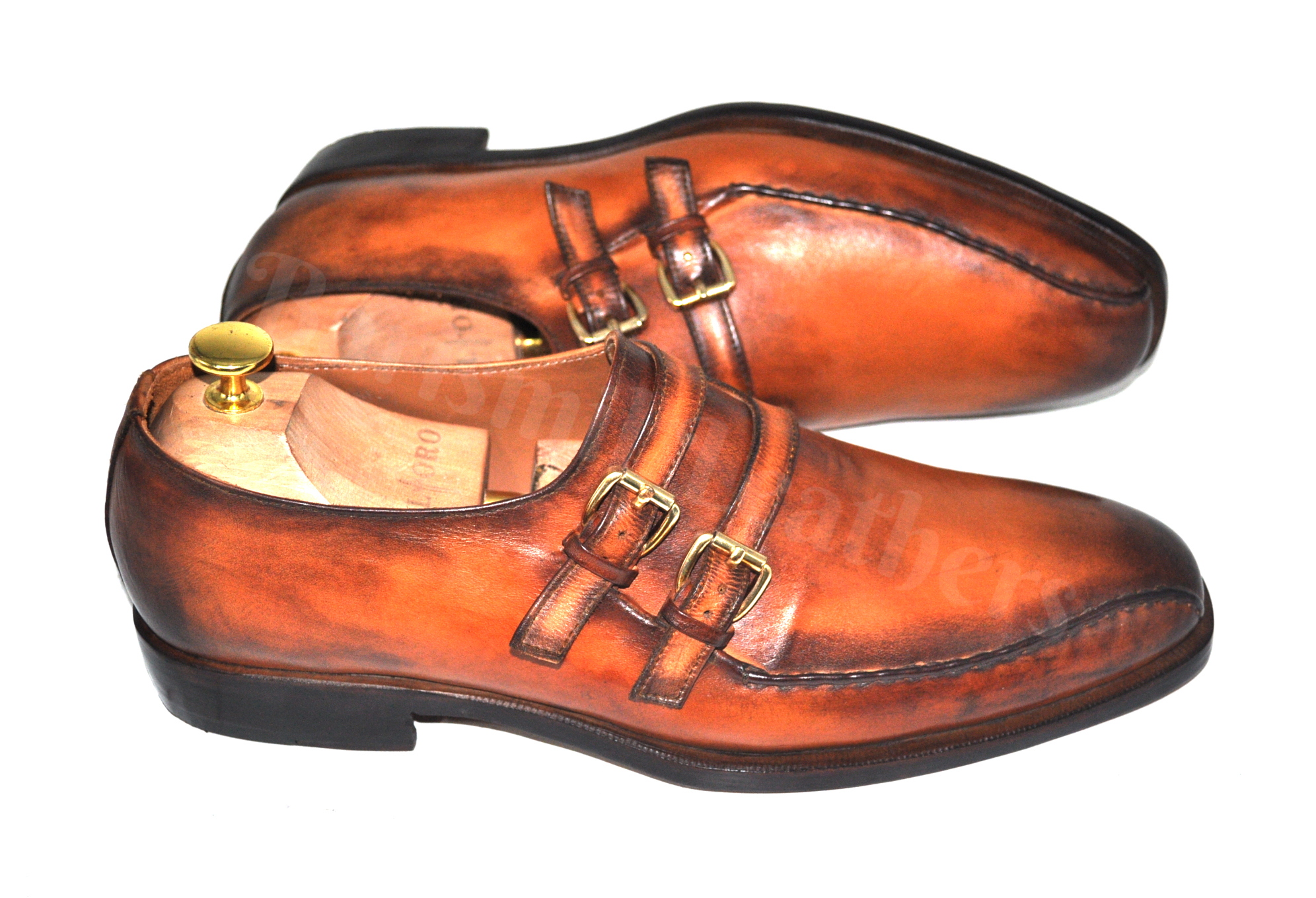 Handmade leather double monk brown patina dress monk strap shoes for men