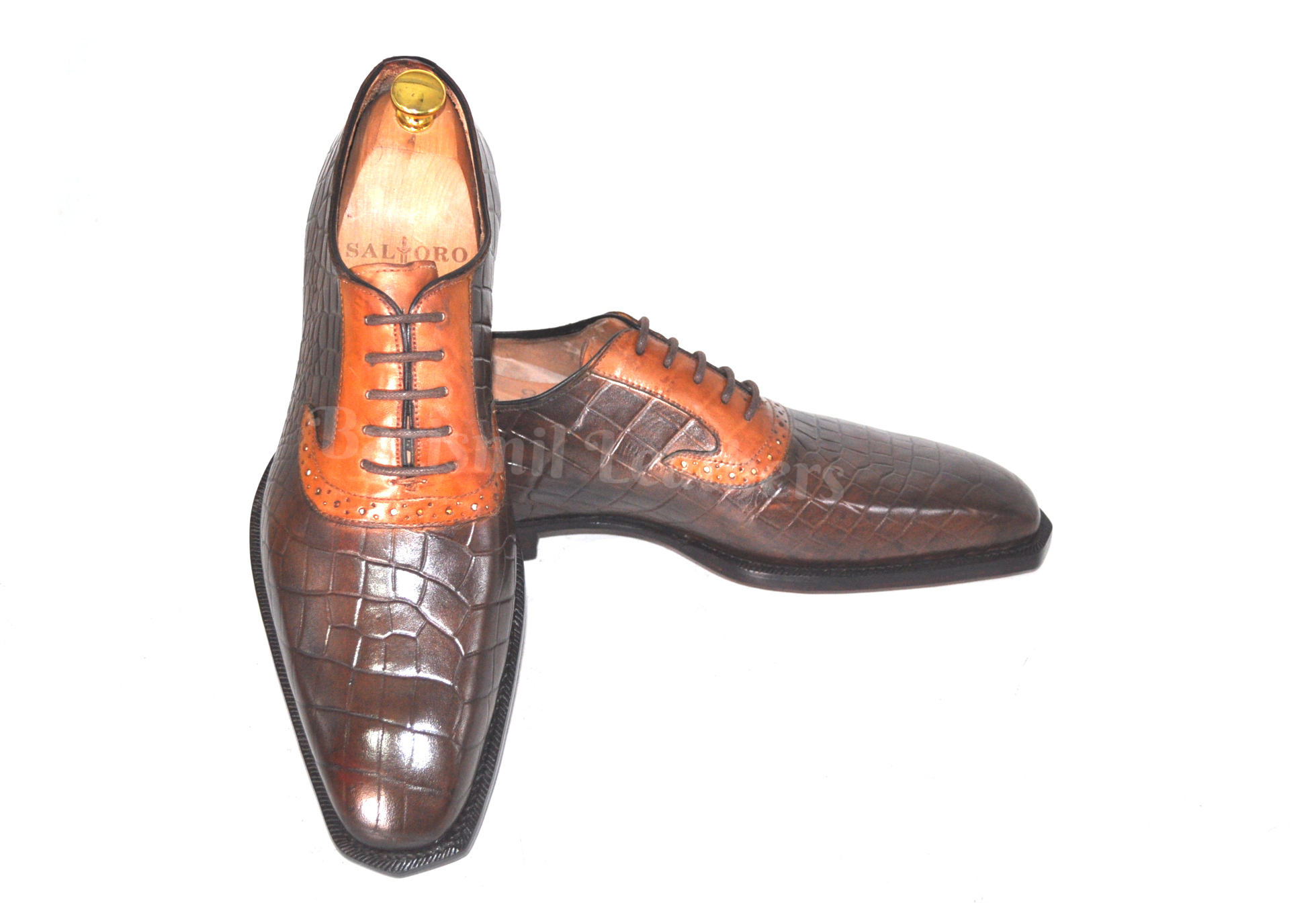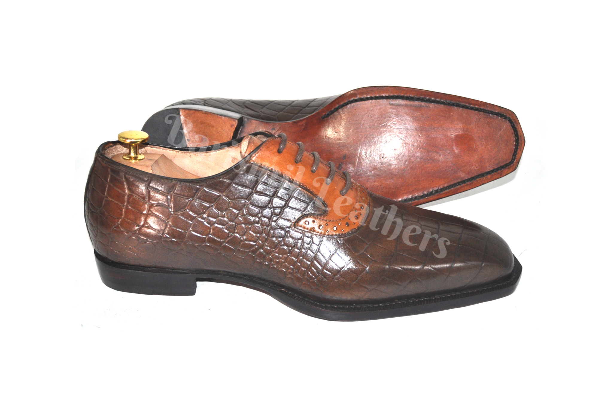 Handmade lace up oxford crocodile impression leather brown patina men dress lace up leather shoes