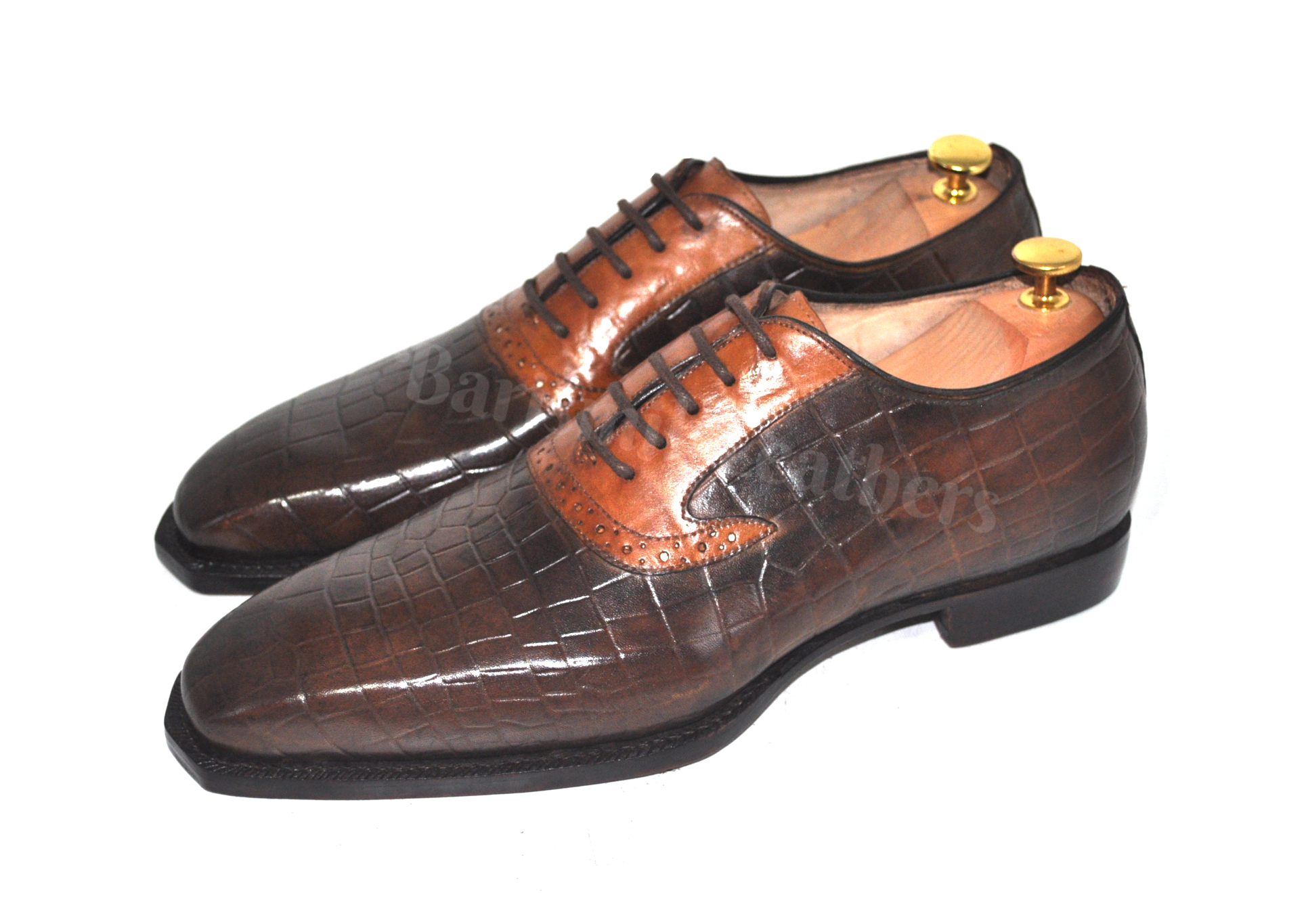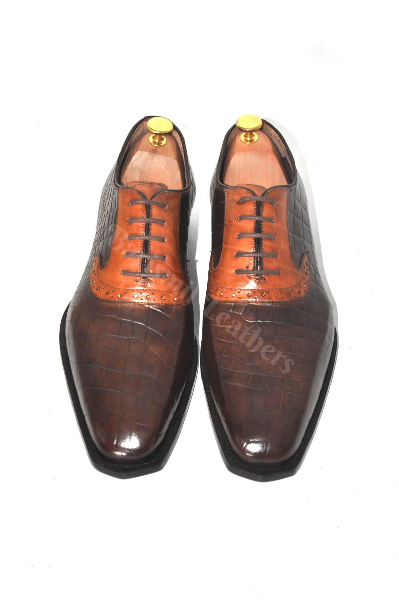 Handmade lace up oxford crocodile impression leather brown patina men dress lace up leather shoes.