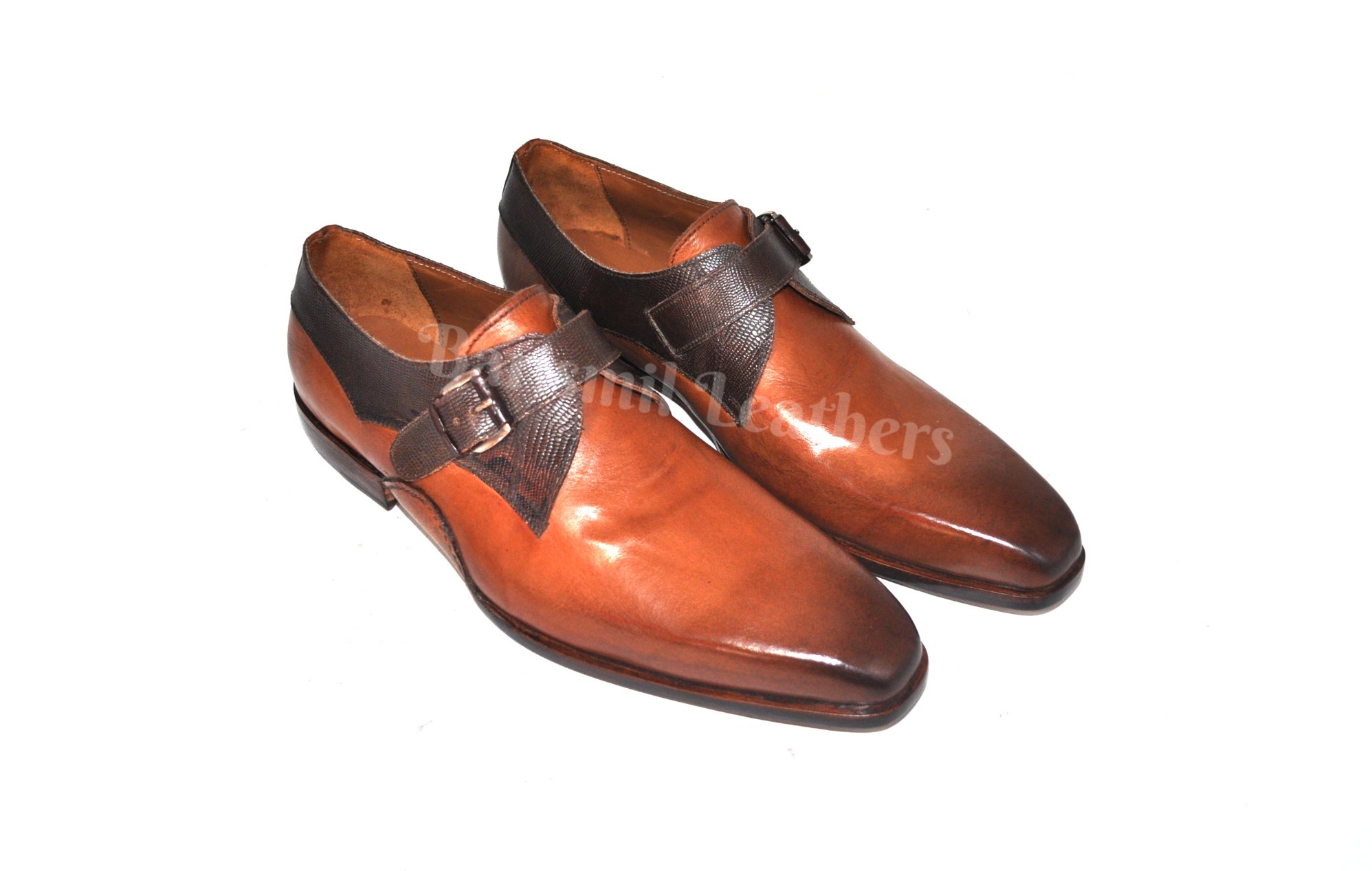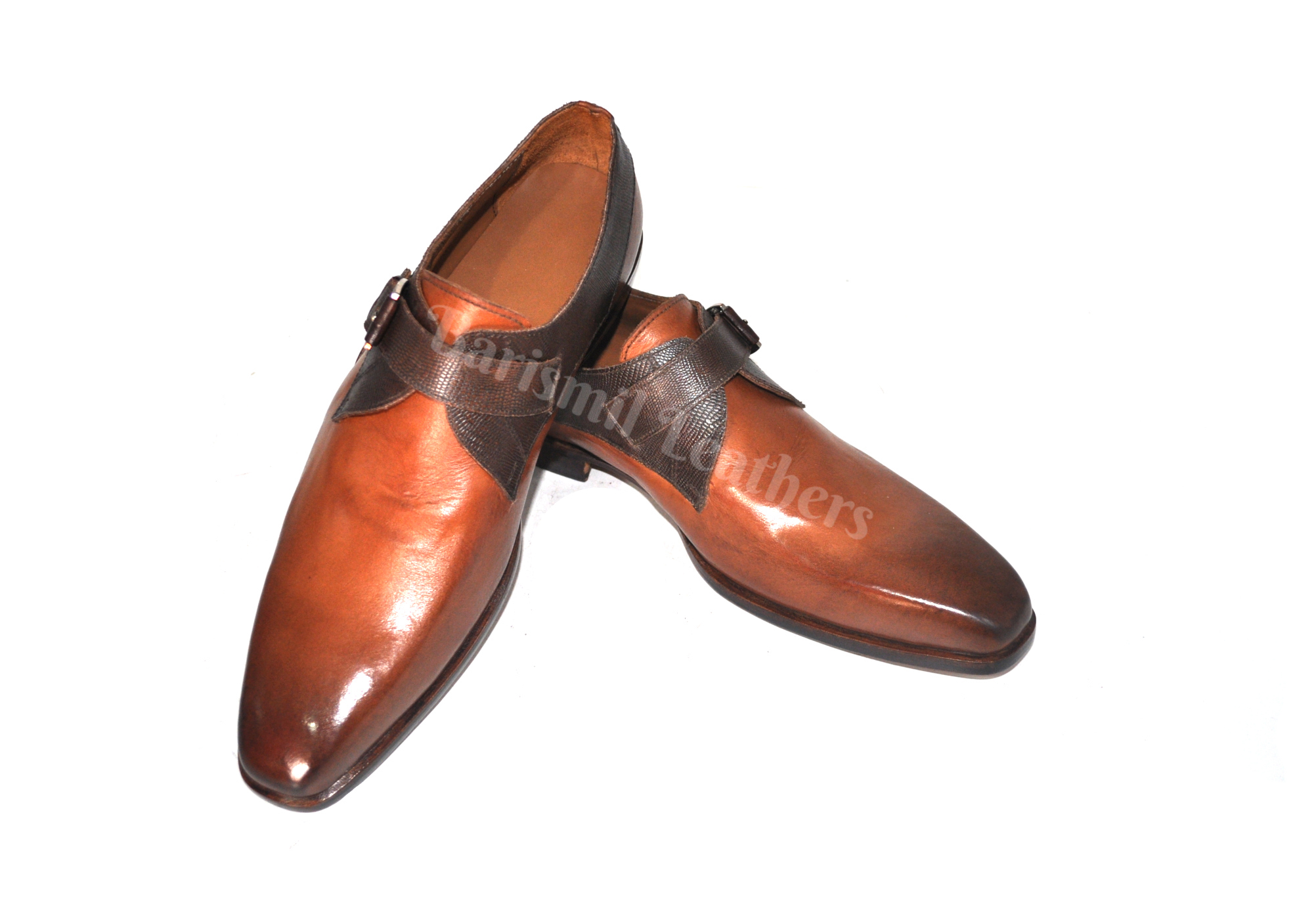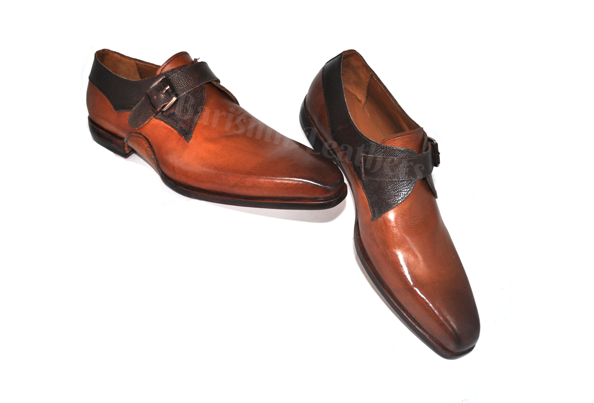 Men handmade monk shoes brown patina men dress two tone monk strap leather shoes