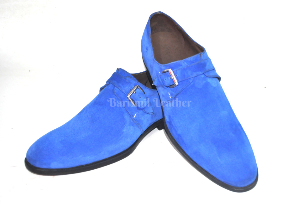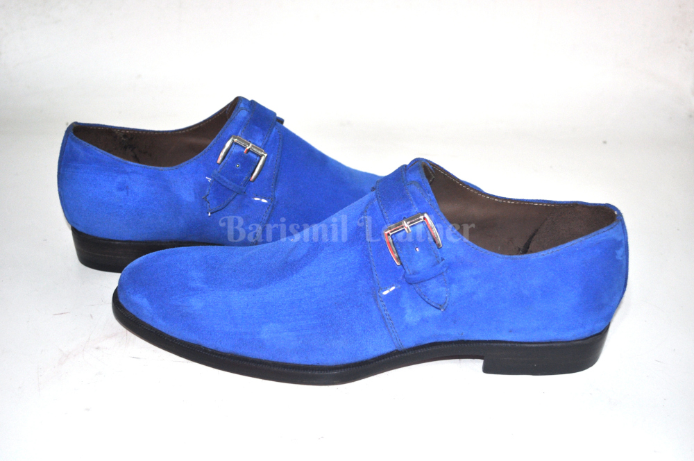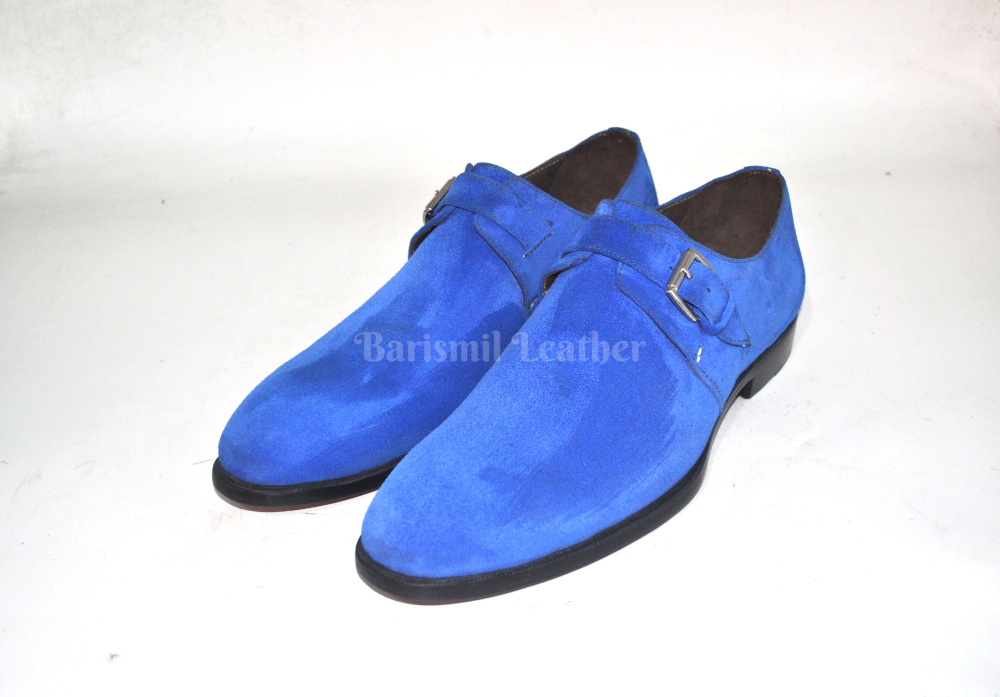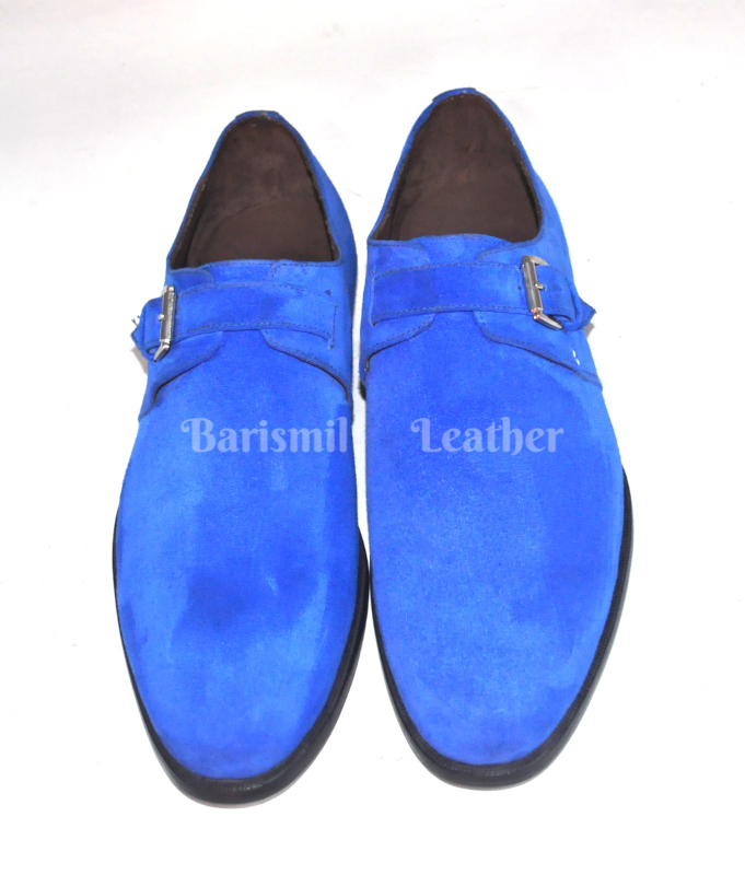 Handmade monk strap blue suede leather dress monk shoes for men.