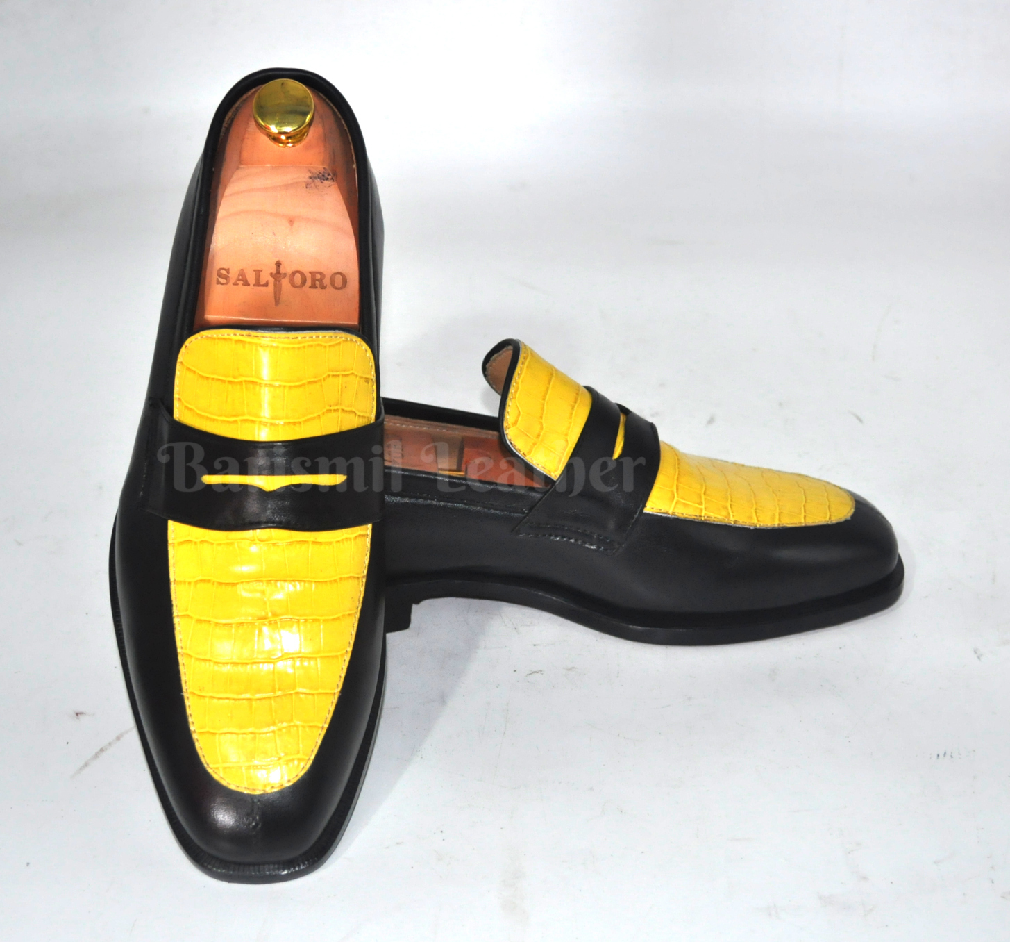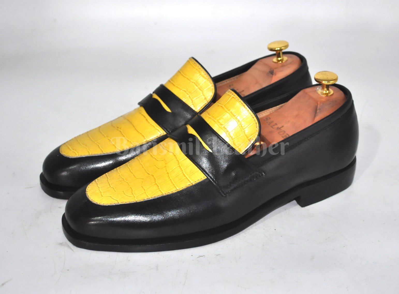 Handmade leather loafers two tone black and yellow men dress formal shoes.