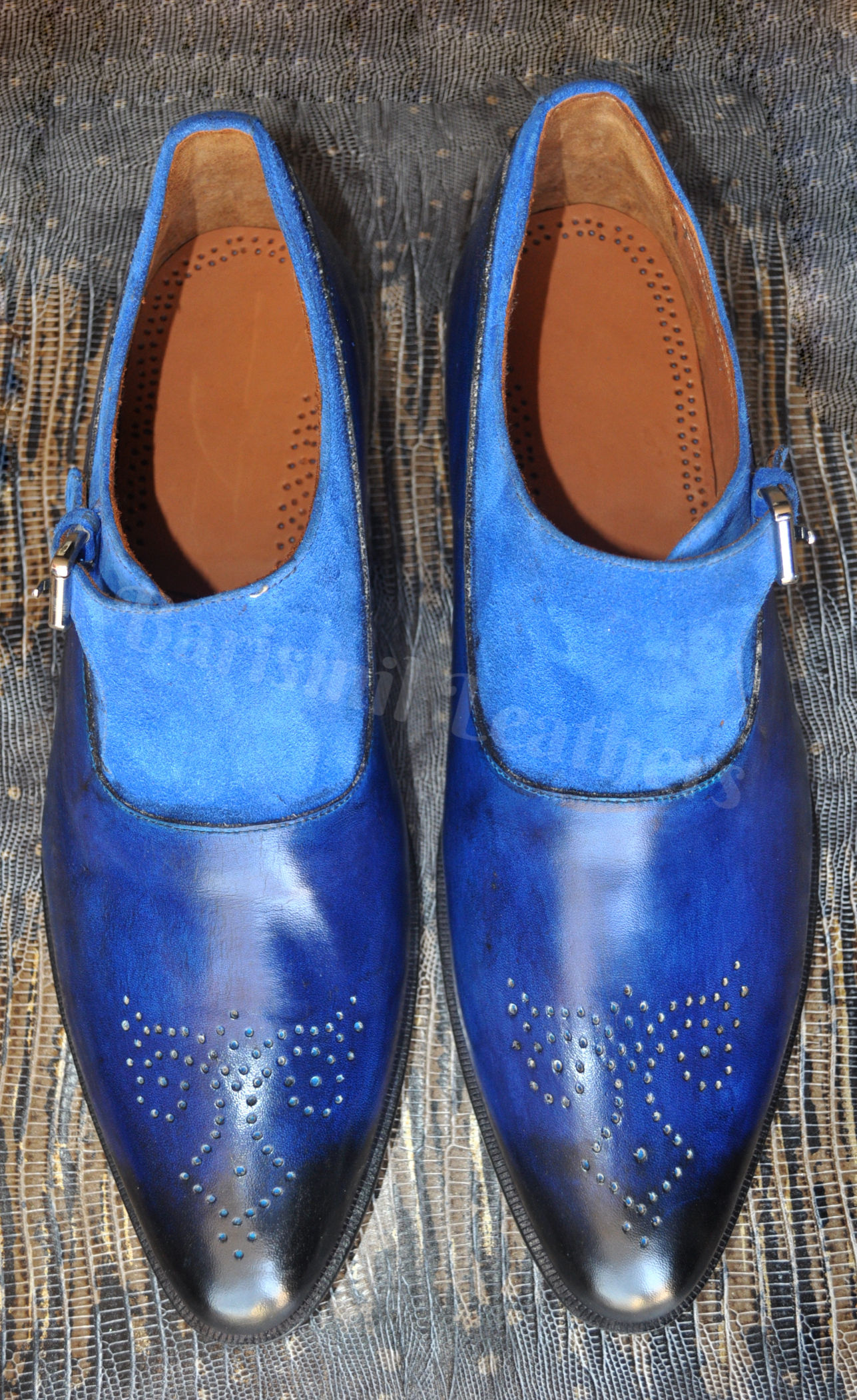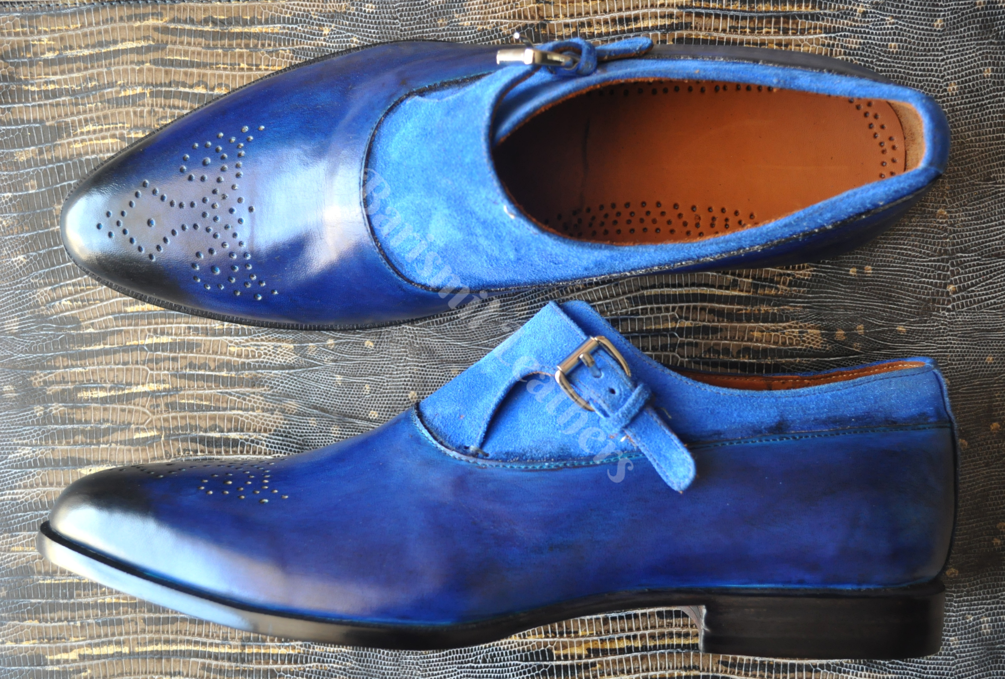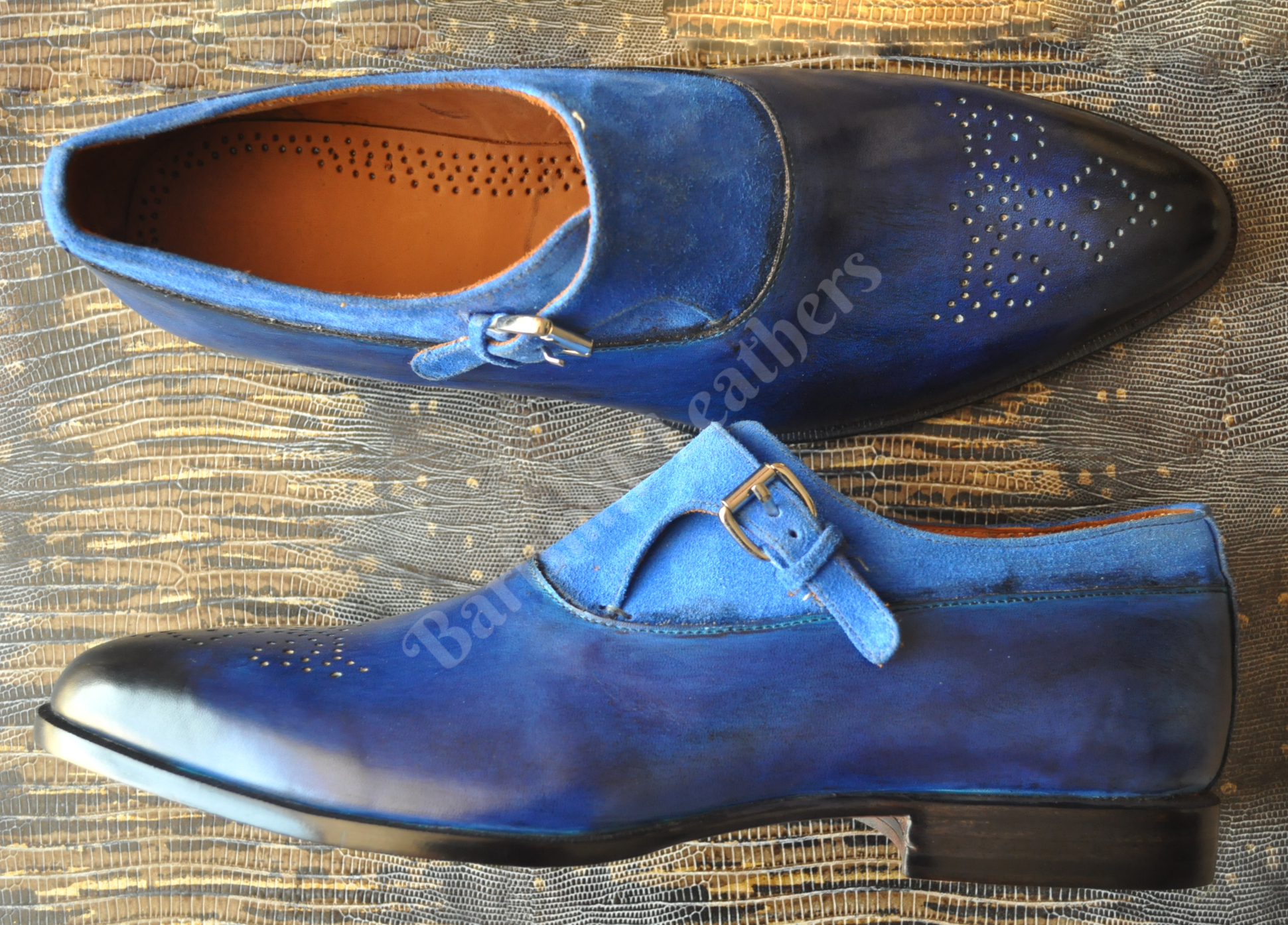 Men handmade monk strap blue patina leather and blue suede leather dress formal monk shoes.