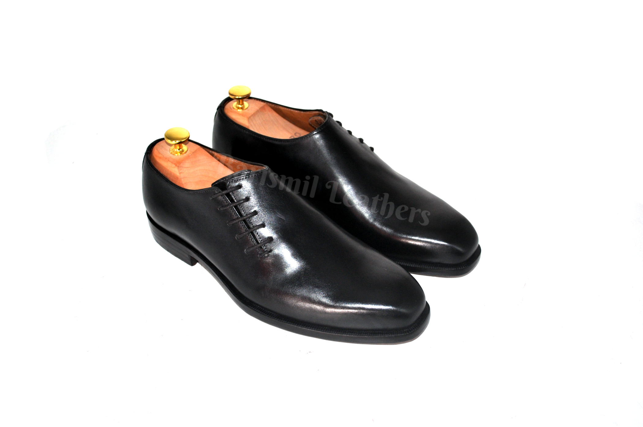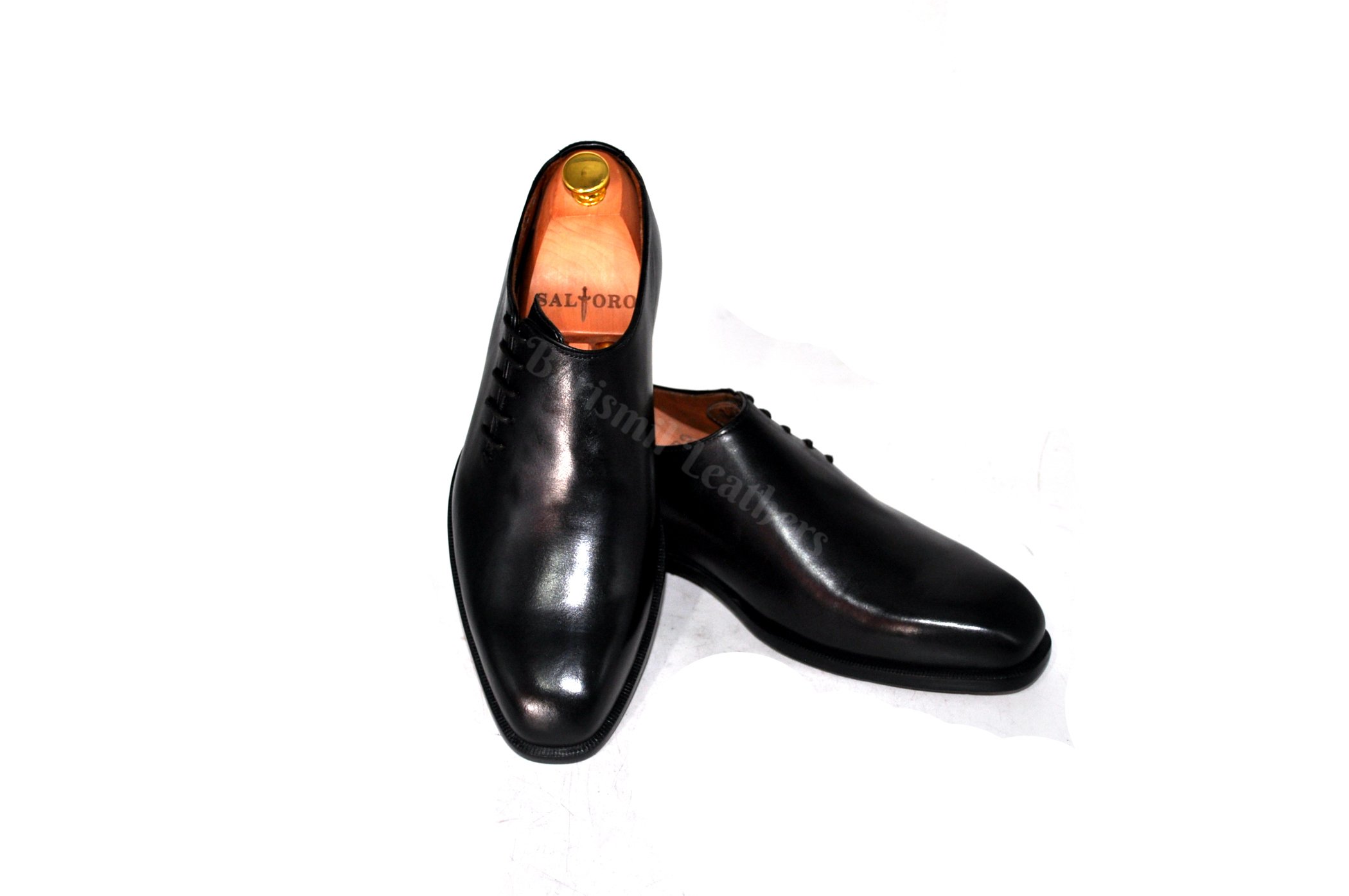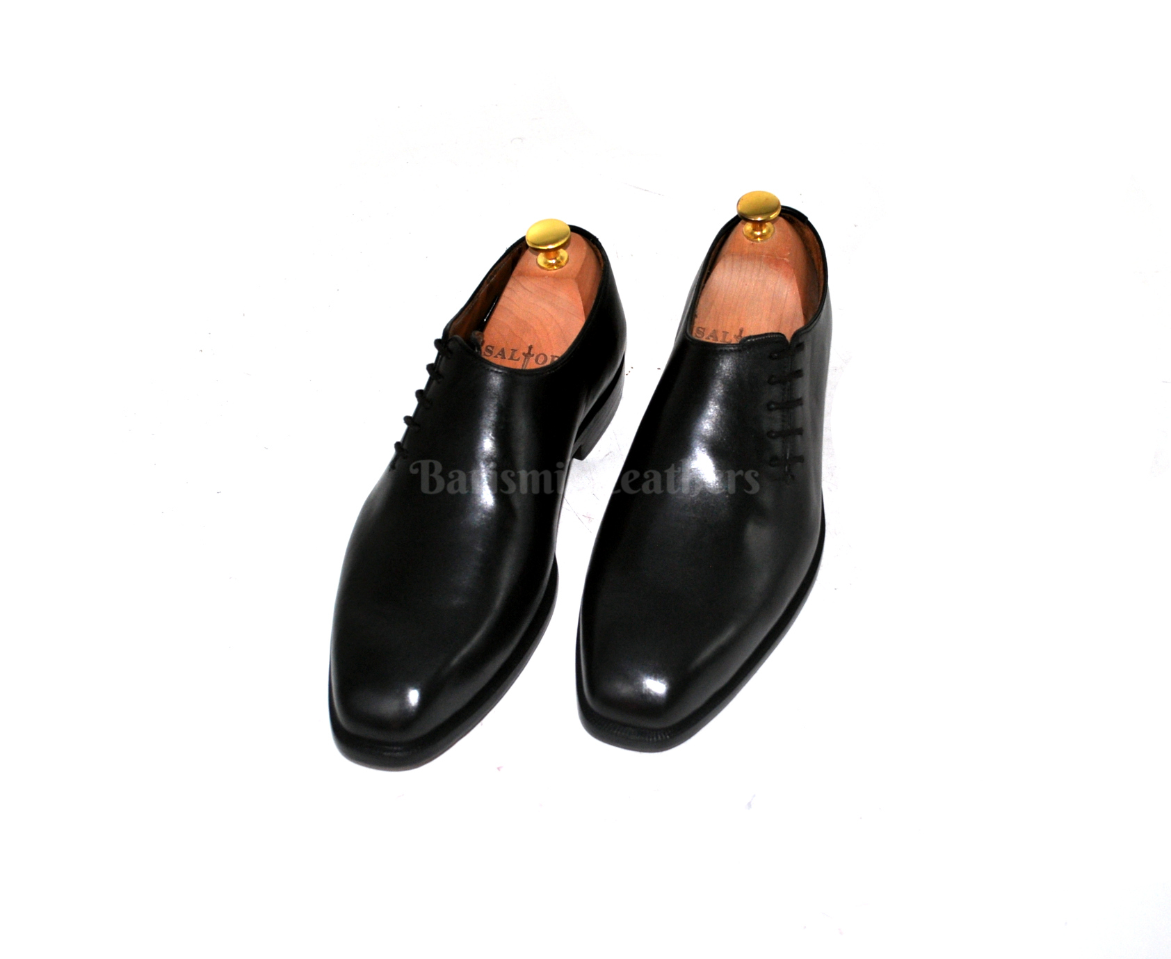 Handmade oxfords black leather side lace up whole cut man dress shoes
