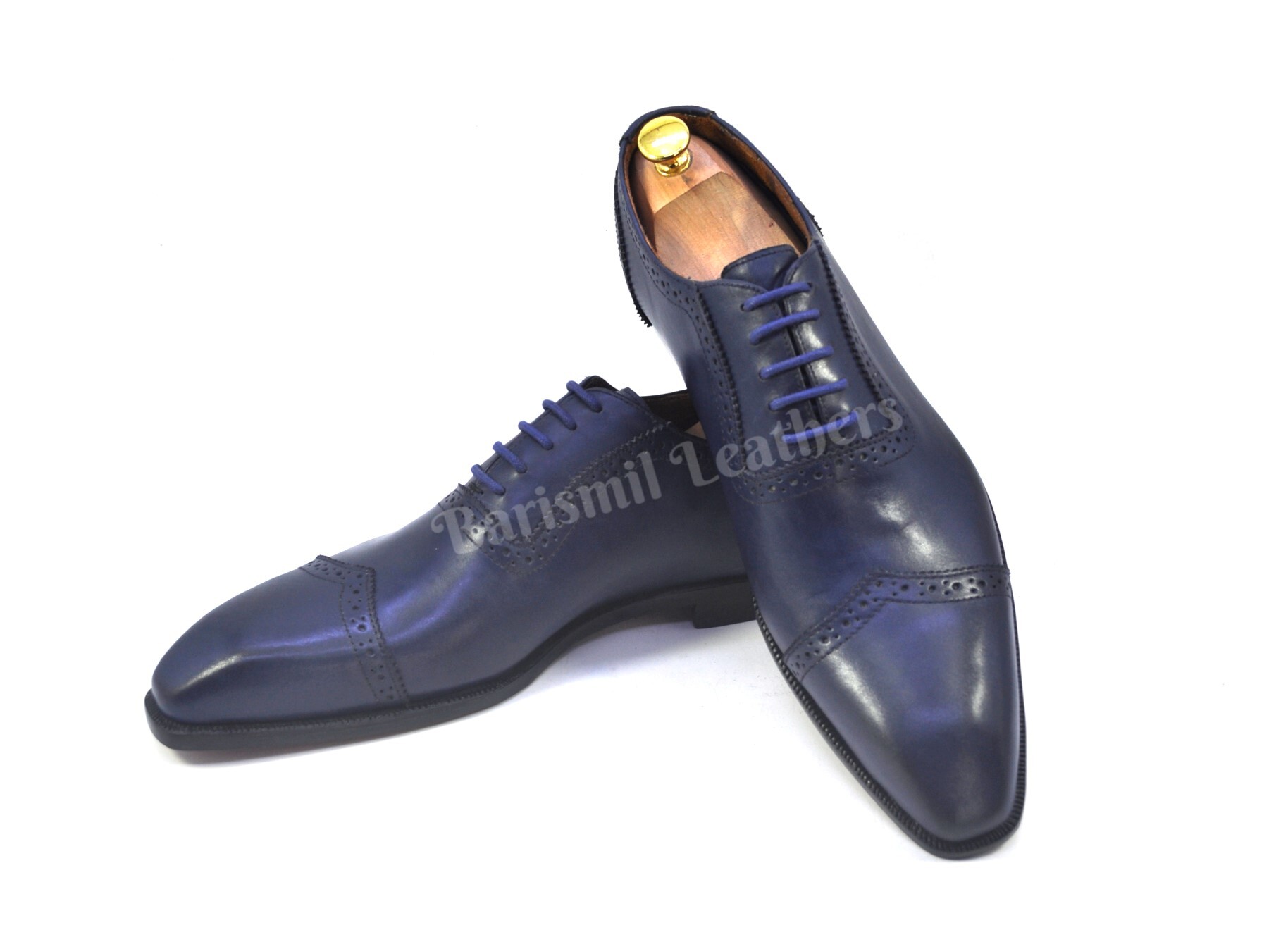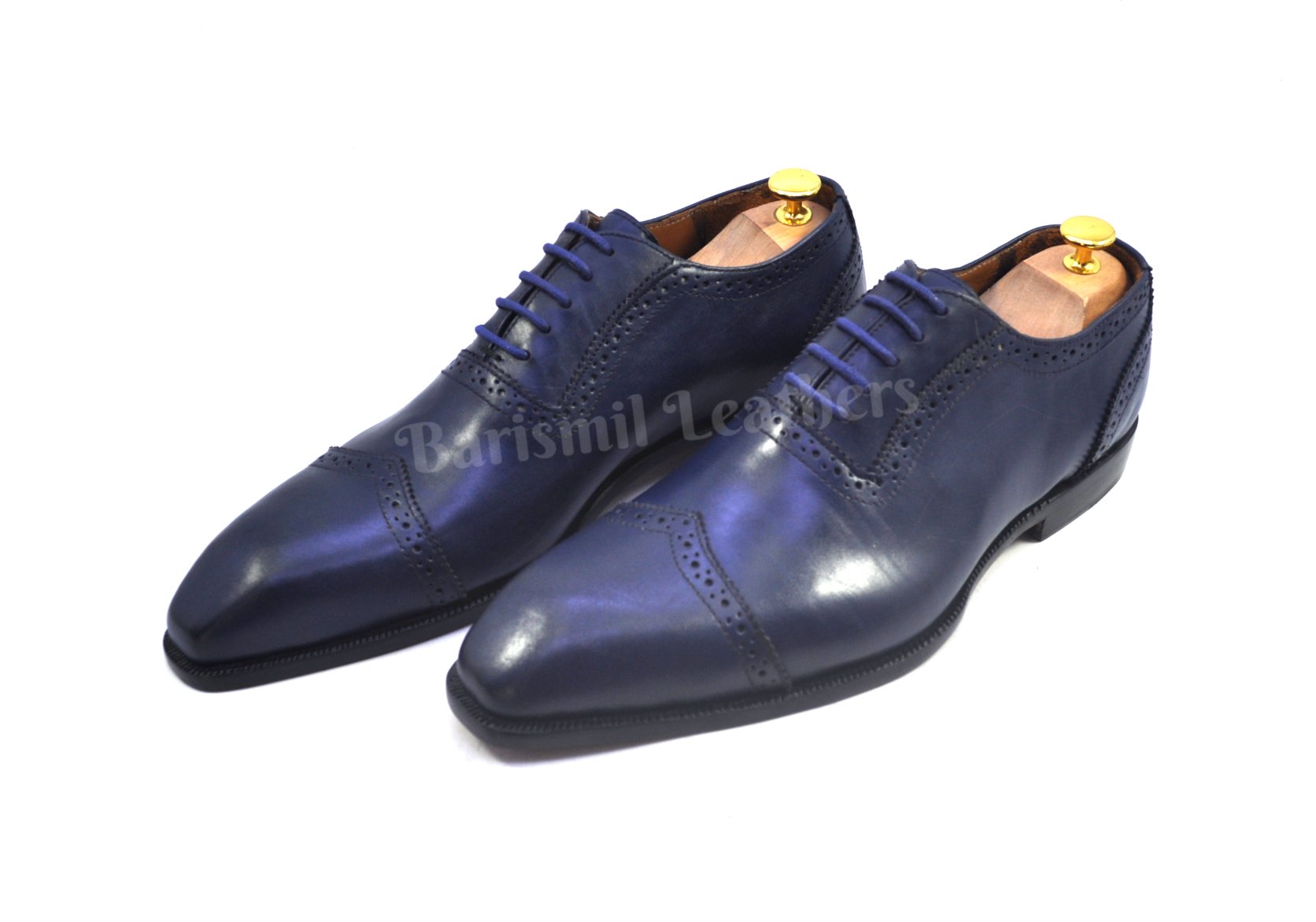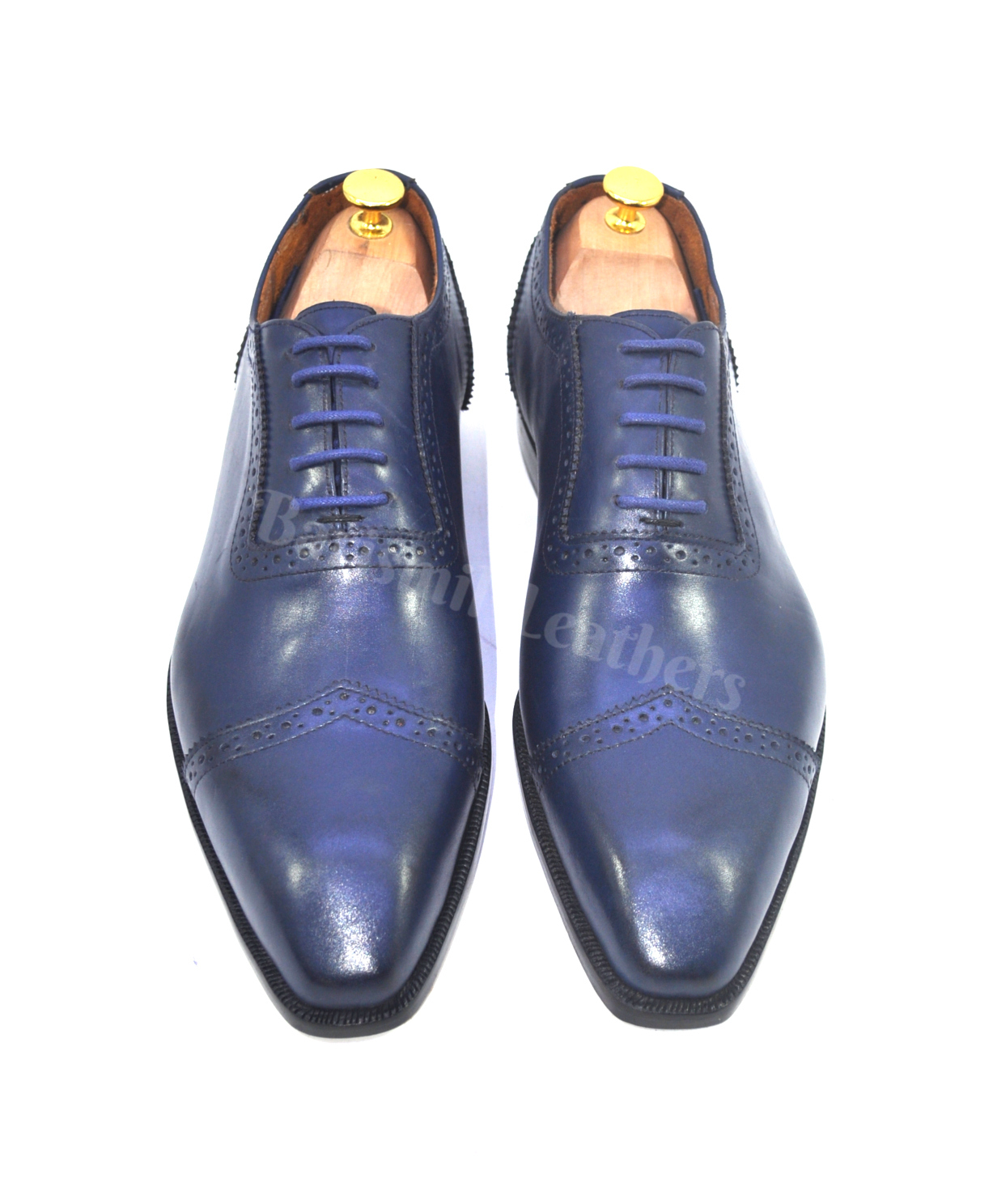 Handmade leather oxfords wingtip and brogue blue leather lace up new dress shoes for men.