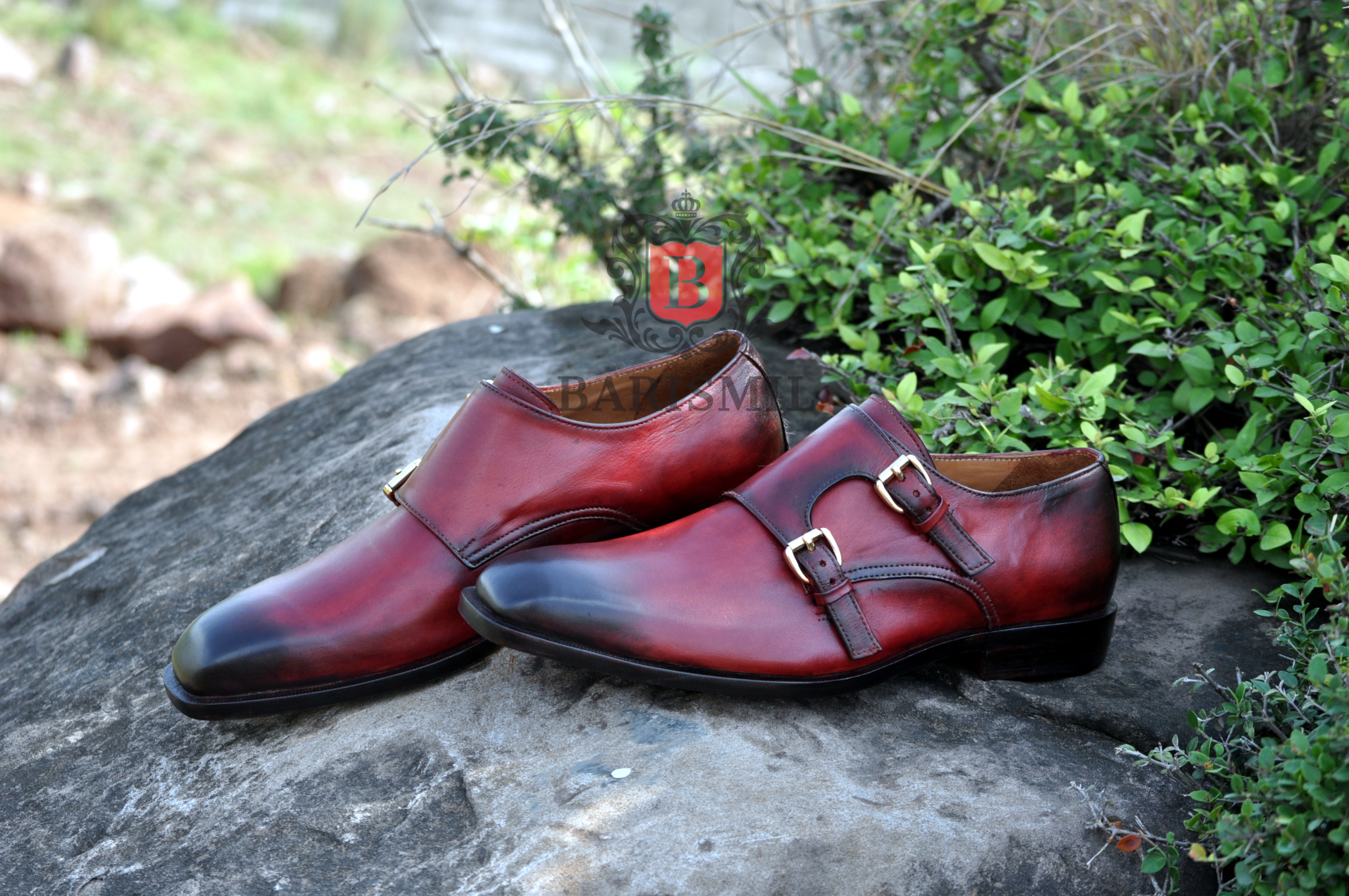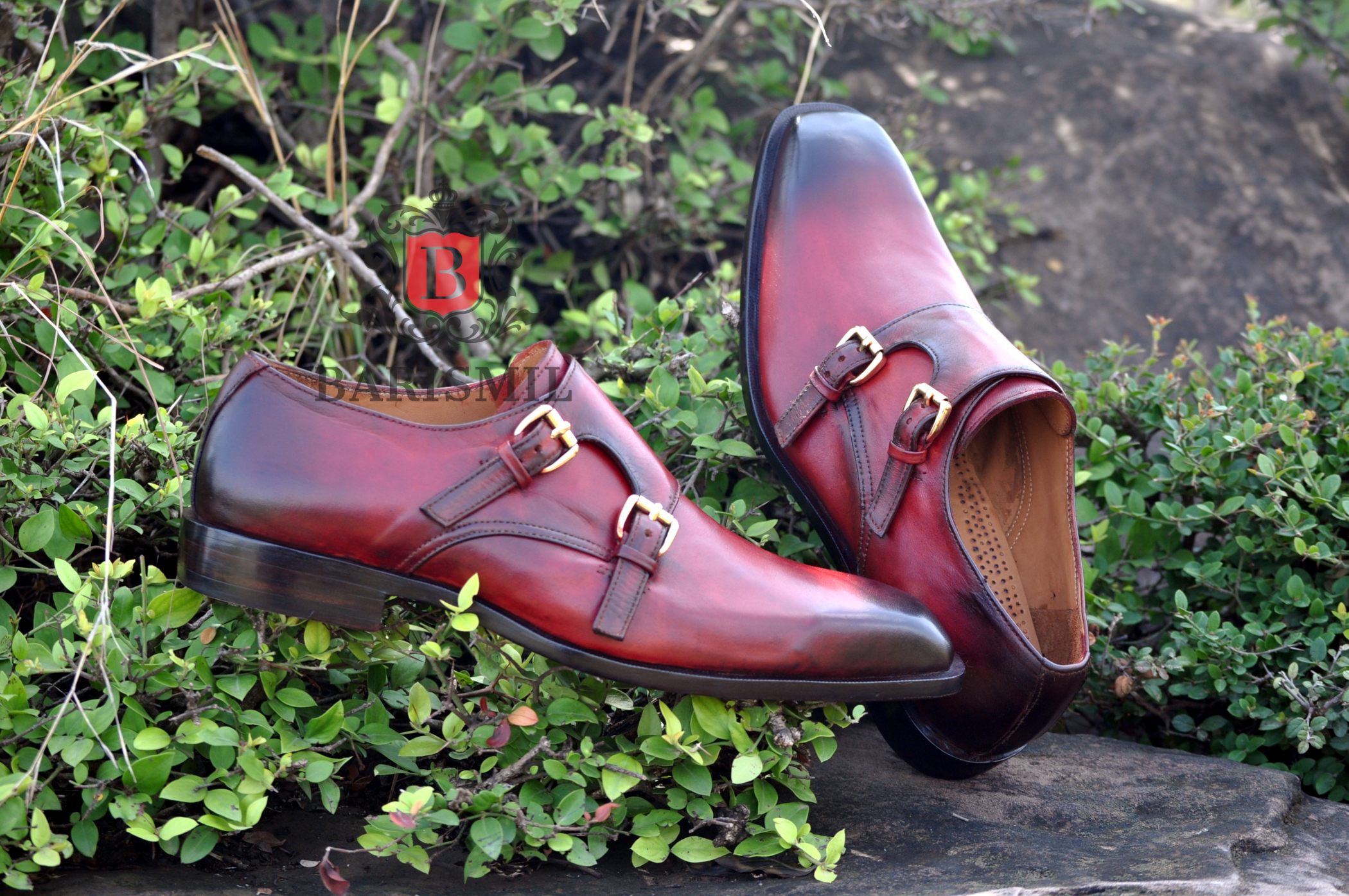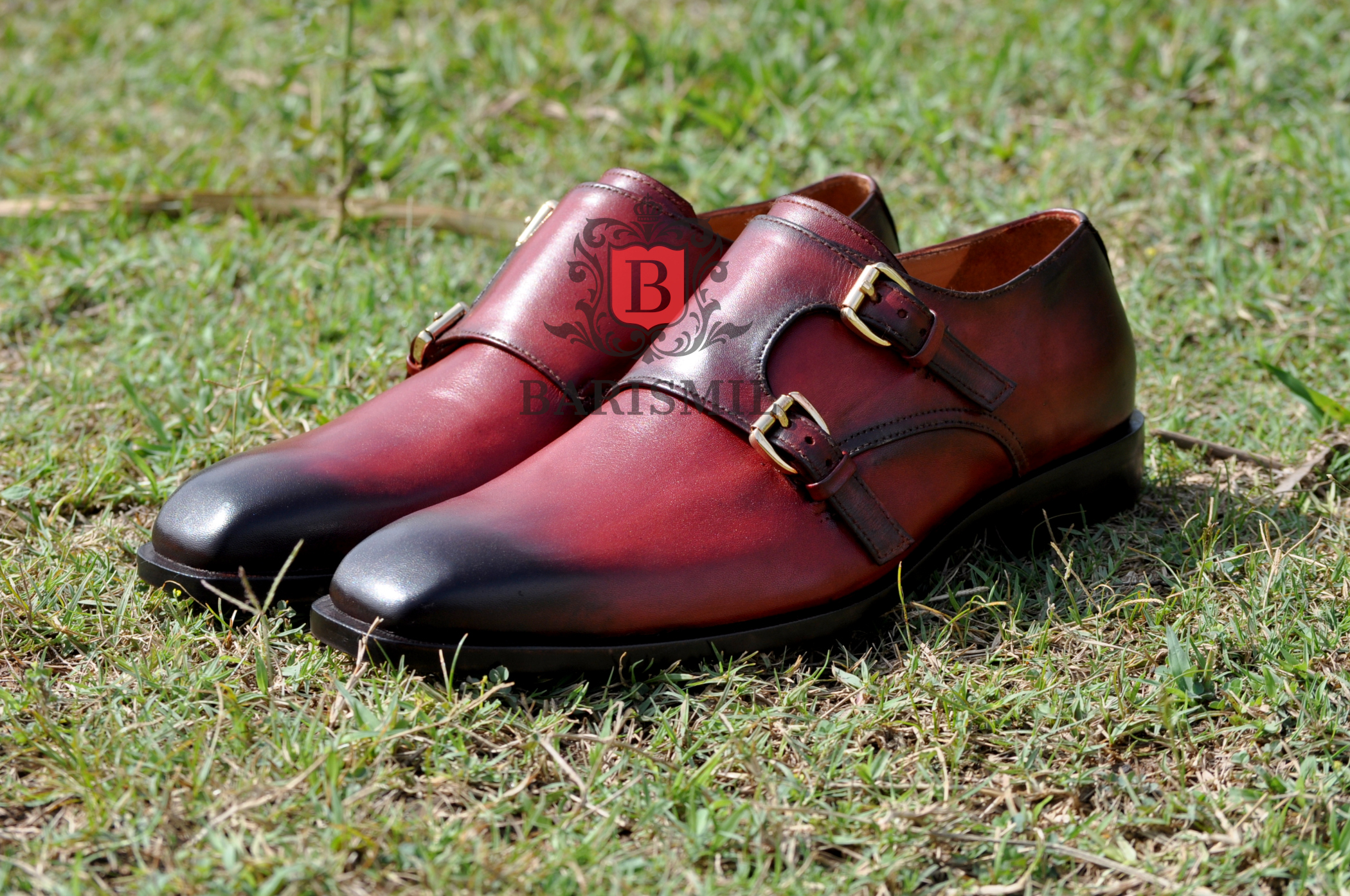 New Handmade double monk strap shoes burgundy patina dress monk shoes for men
